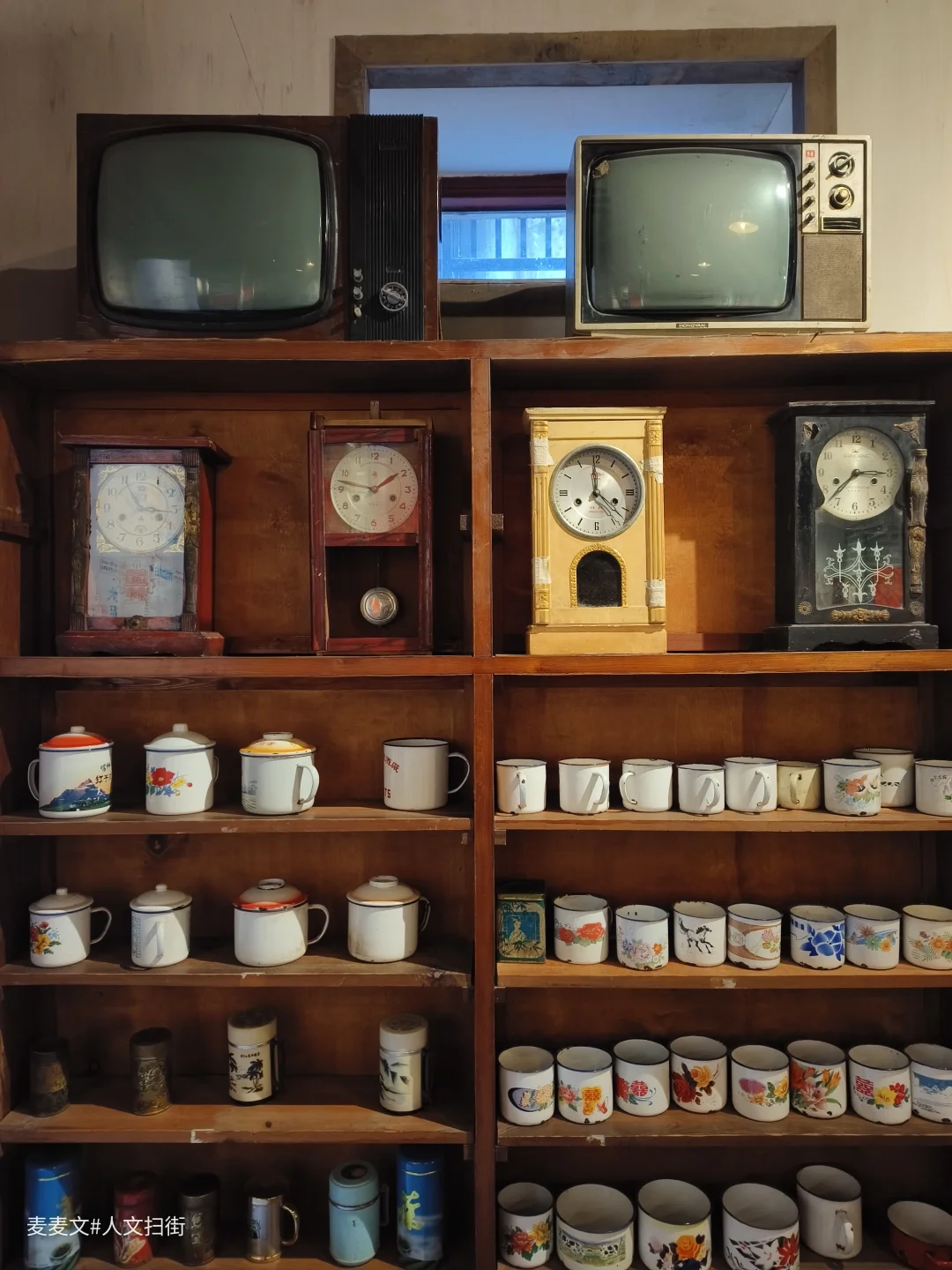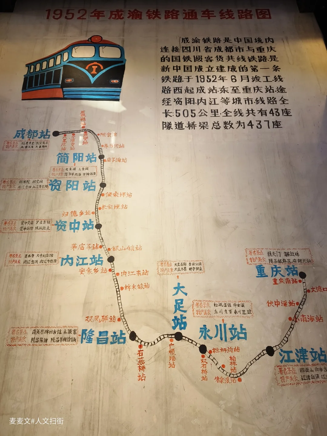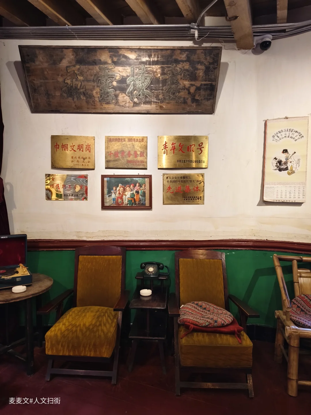 茶馆里藏满了铁路与老重庆的记忆:墙上钉着密密麻麻的旧门牌号,复刻的东风7159绿皮火车头驾驶室嵌在墙里,1952年成渝铁路通车线路图静静铺展,老式电视机、留声机、盖碗茶碗……每一件老物件都在诉说着过去的故事。