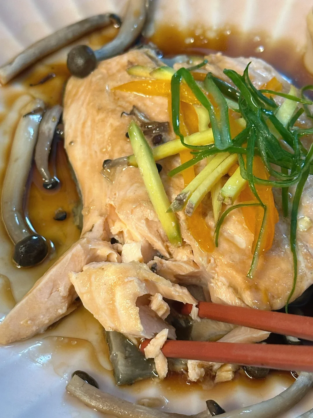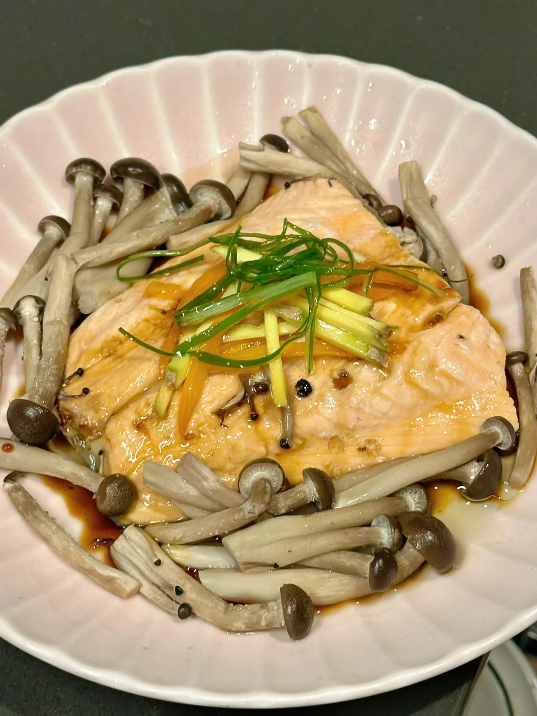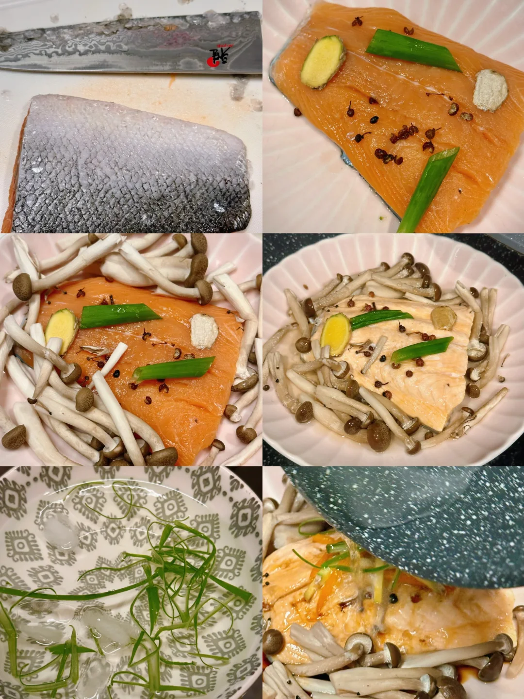 说起三文鱼的吃法,大家第一时间想到的应该不是刺身就是煎烤,这回尝试了用中式清蒸的方式处理,也很好吃哎! 热油泼出的葱香和三文鱼的香气混合在一起特别勾人食欲!蒸得恰到好处的鱼肉一样可以很香嫩肥美。我还在底下垫了一些蘑菇,吸收了鱼油和酱汁,特别鲜美! 而且清蒸的方式不会给屋子里带来油烟,而且更不容易破坏鱼肉里的omega3脂肪,也是更方便健康的选择👌 - 📒食材 三文鱼一块,蟹味菇半包,生姜,葱段,盐,花椒粒,米酒,油,生抽。 - 📖做法 超市买的三文鱼记得刀背再刮一下外皮,确保鳞片都去除,因为清蒸鱼里吃到鳞片会比煎鱼更突兀; 三文鱼清水冲洗后厨房纸擦干,抹上盐和花椒粒,盘子底部垫上菌菇,放上三文鱼,顶上再盖葱段和姜片; 蒸锅上汽后,放入三文鱼,我这么大小的鱼排,中火蒸6分钟; 盘子里的水倒掉,淋生抽/蒸鱼豉油,顶上放葱丝,泼热油即可享用! - 🌟小贴士 同样的做法也可以Chilean sea bass或者branzino!菌菇也可以替换成金针菇/白玉菇! -