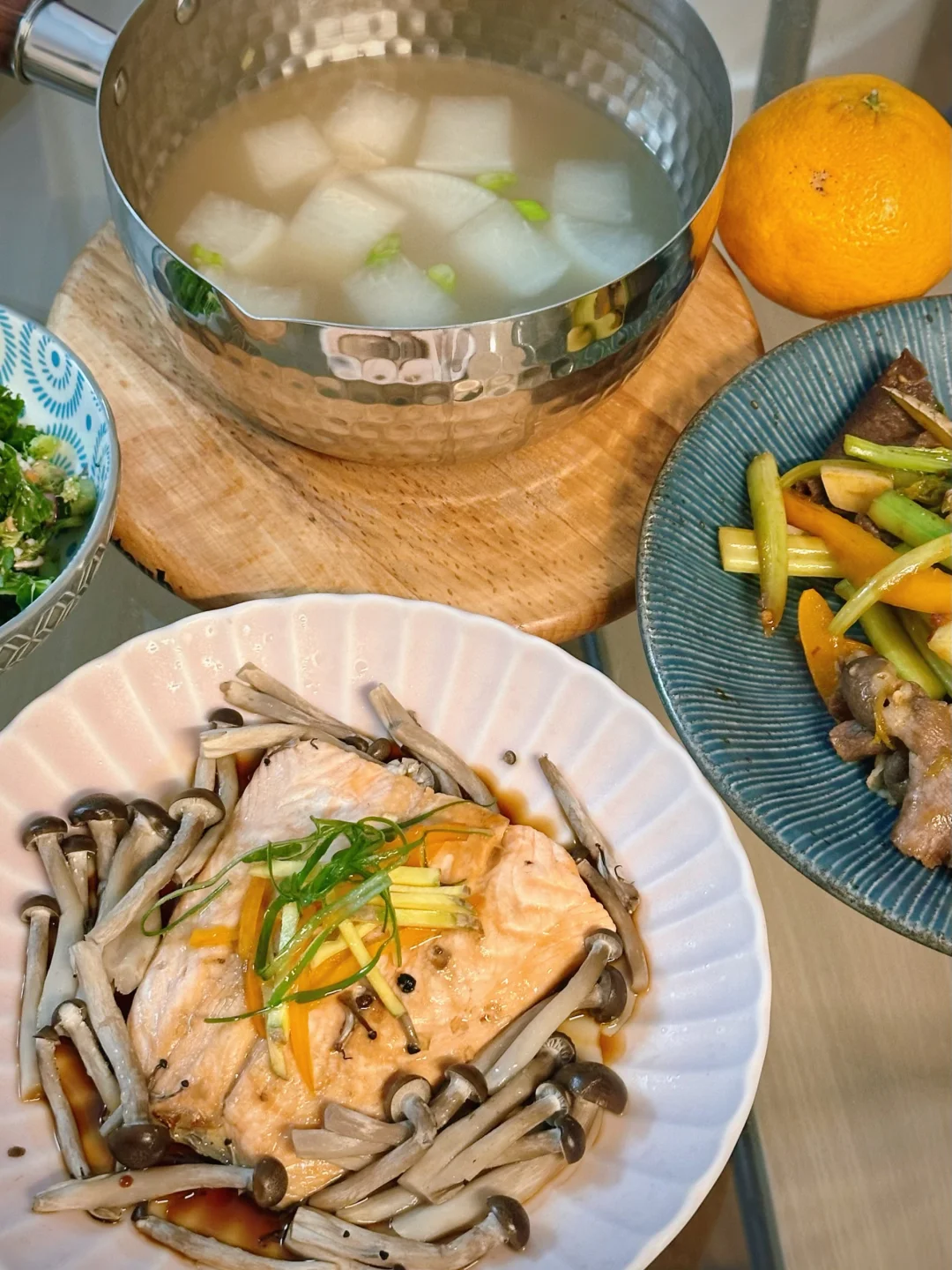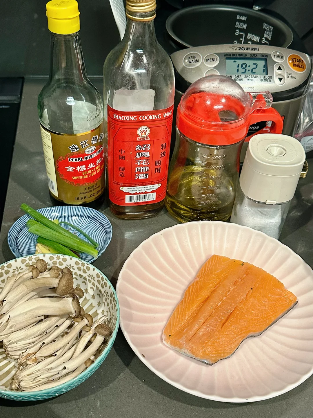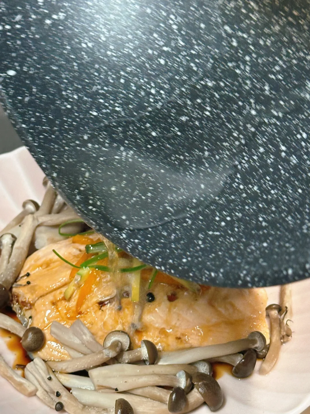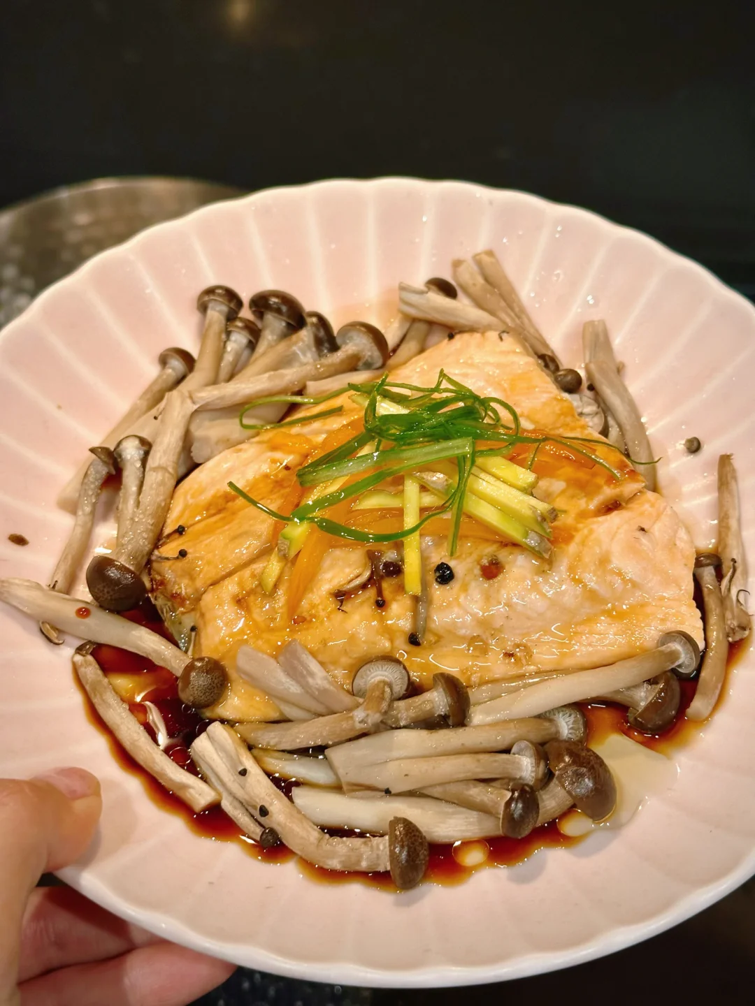 说起三文鱼的吃法,大家第一时间想到的应该不是刺身就是煎烤,这回尝试了用中式清蒸的方式处理,也很好吃哎! 热油泼出的葱香和三文鱼的香气混合在一起特别勾人食欲!蒸得恰到好处的鱼肉一样可以很香嫩肥美。我还在底下垫了一些蘑菇,吸收了鱼油和酱汁,特别鲜美! 而且清蒸的方式不会给屋子里带来油烟,而且更不容易破坏鱼肉里的omega3脂肪,也是更方便健康的选择👌 - 📒食材 三文鱼一块,蟹味菇半包,生姜,葱段,盐,花椒粒,米酒,油,生抽。 - 📖做法 超市买的三文鱼记得刀背再刮一下外皮,确保鳞片都去除,因为清蒸鱼里吃到鳞片会比煎鱼更突兀; 三文鱼清水冲洗后厨房纸擦干,抹上盐和花椒粒,盘子底部垫上菌菇,放上三文鱼,顶上再盖葱段和姜片; 蒸锅上汽后,放入三文鱼,我这么大小的鱼排,中火蒸6分钟; 盘子里的水倒掉,淋生抽/蒸鱼豉油,顶上放葱丝,泼热油即可享用! - 🌟小贴士 同样的做法也可以Chilean sea bass或者branzino!菌菇也可以替换成金针菇/白玉菇! -