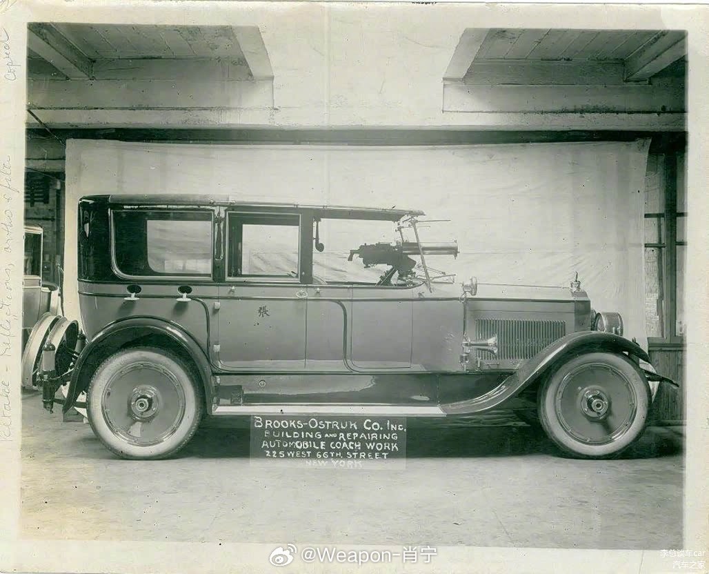 照片中的历史 民国时期奉系军阀张作霖“大帅府”门前的警卫和他那辆“独一无二”的座驾。单从外观上看,副驾驶窗口伸出的一挺轻机枪,就知道这辆车非常特别。早在1918年,张作霖担任东三省巡阅使时,东北局势混乱,鱼龙混杂。为确保自身安全,他向美国定制了一辆兼具防御和攻击能力的汽车。这辆车的原型是帕卡德六号。除了配备高性能、马力强劲的发动机外,车身周围都装有防护装甲,车窗由可拆卸的1.8英寸百叶钢板保护。车头配有一挺7.62毫米勃朗宁重机枪,每分钟可发射500多发子弹。除了强大的防护能力,车内的装饰也极尽奢华。座椅等采用红木材质,脚下铺设金色地毯。当时这辆车总共花费了3.5万美元,相当于88辆普通福特汽车的价格。