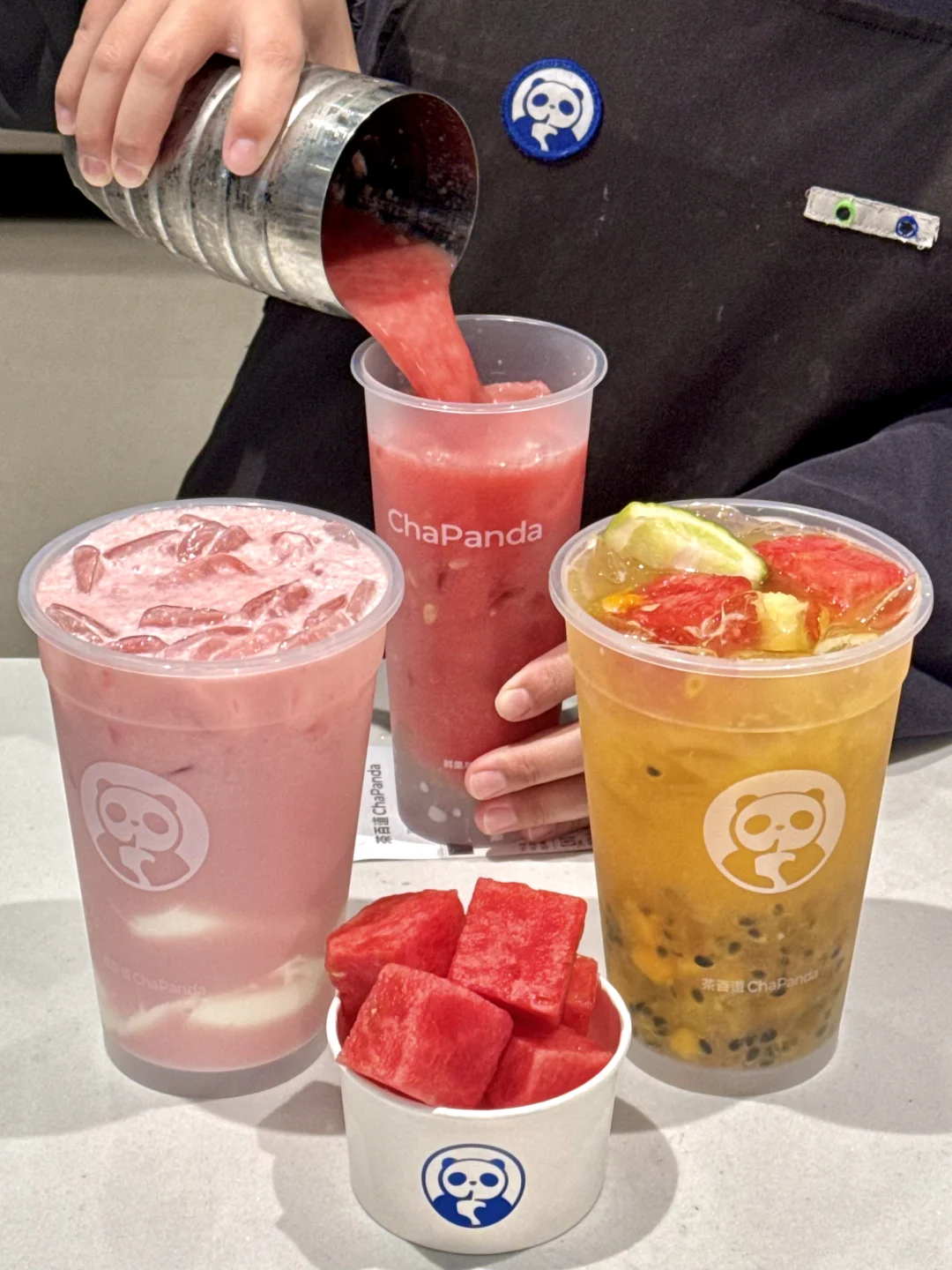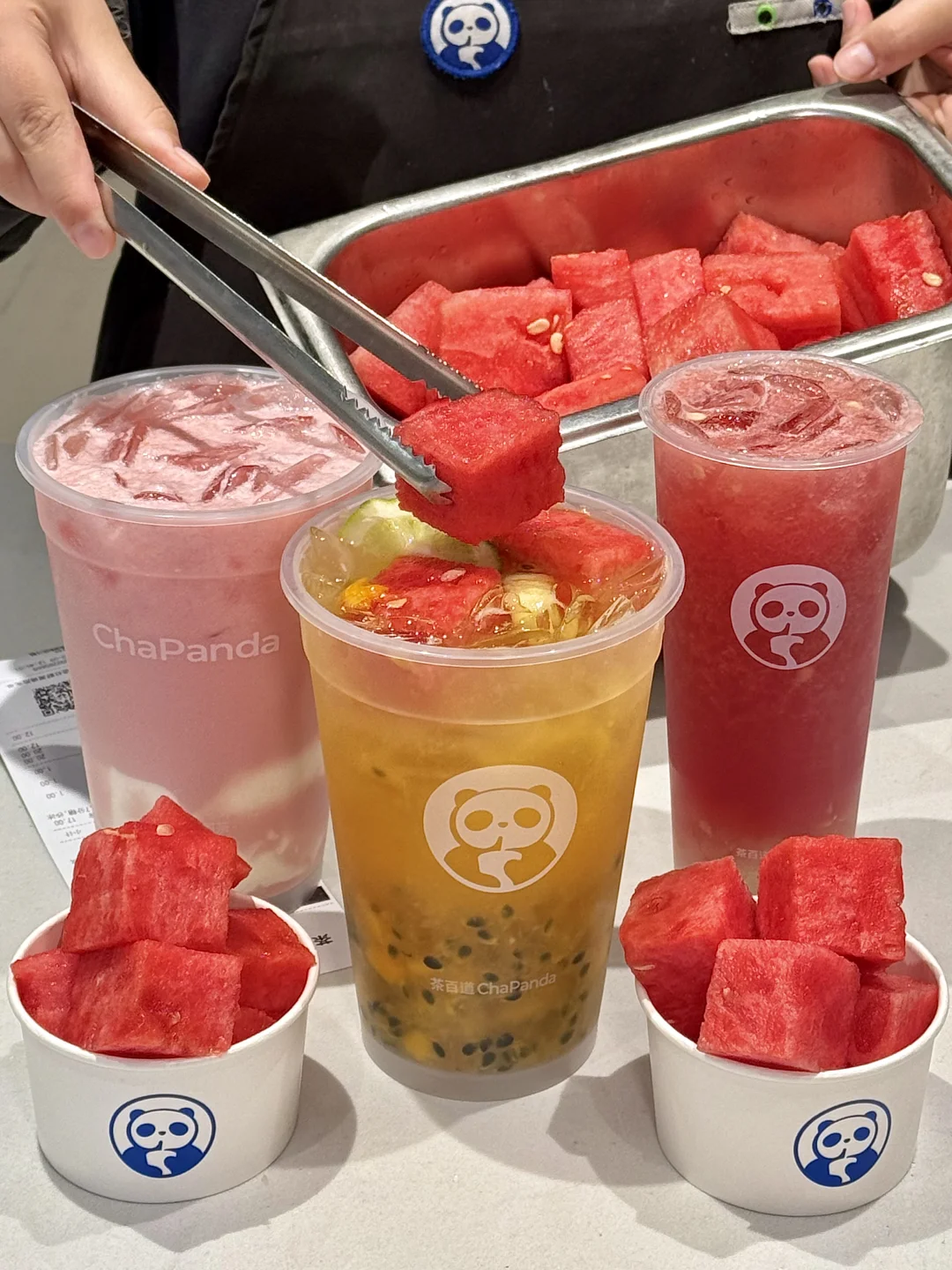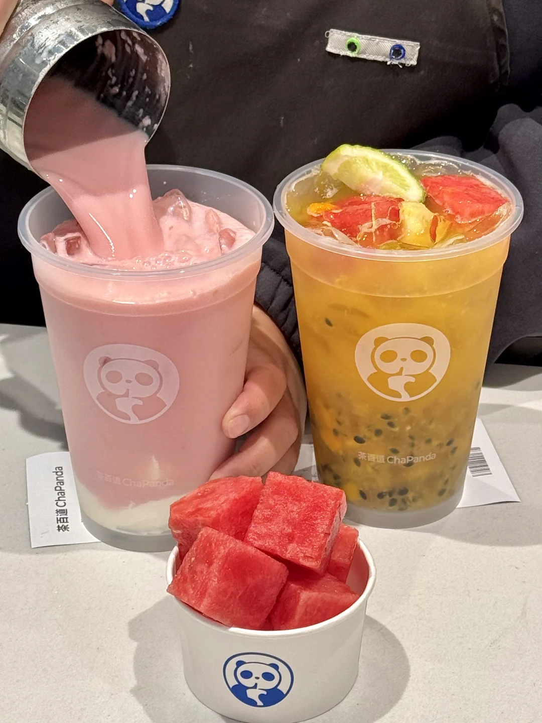刚和朋友说想吃西瓜就看到茶百道店员在搬西瓜,西瓜瘾犯了🤤和朋友迫不及待点了三杯