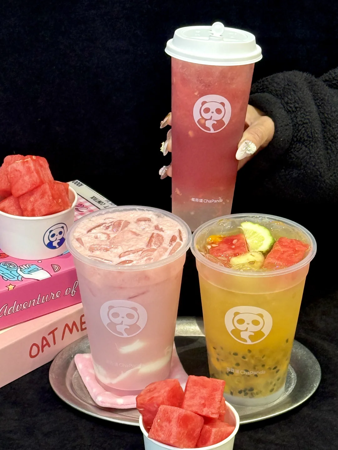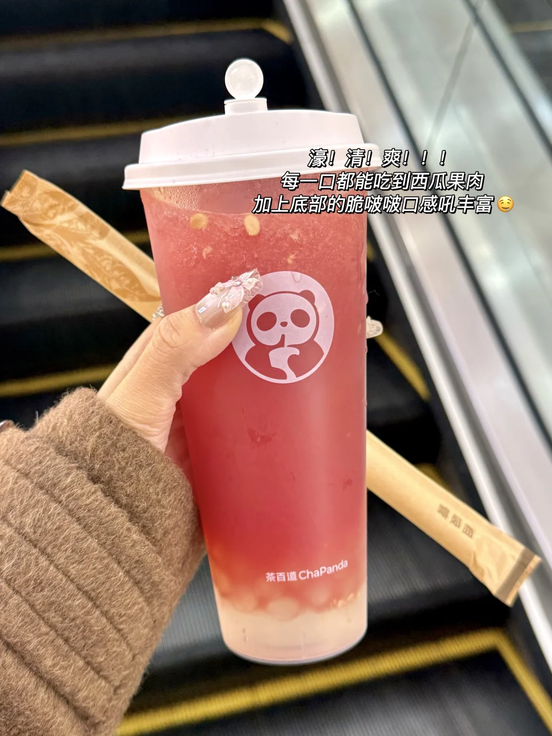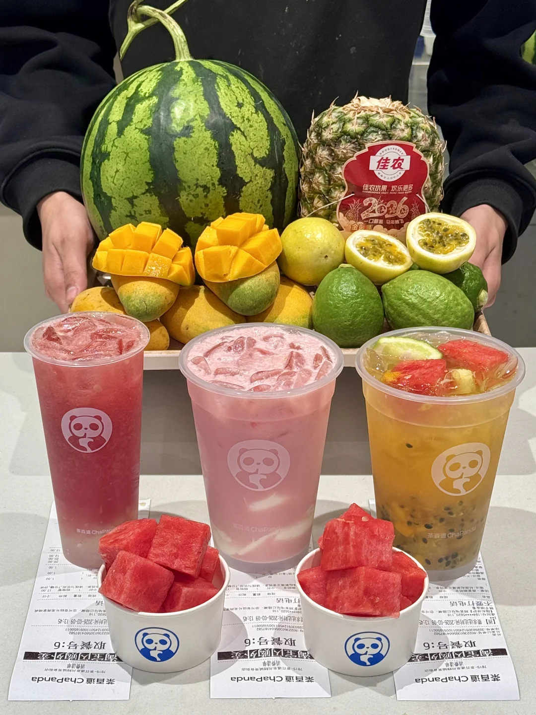 刚和朋友说想吃西瓜就看到茶百道店员在搬西瓜,西瓜瘾犯了🤤和朋友迫不及待点了三杯