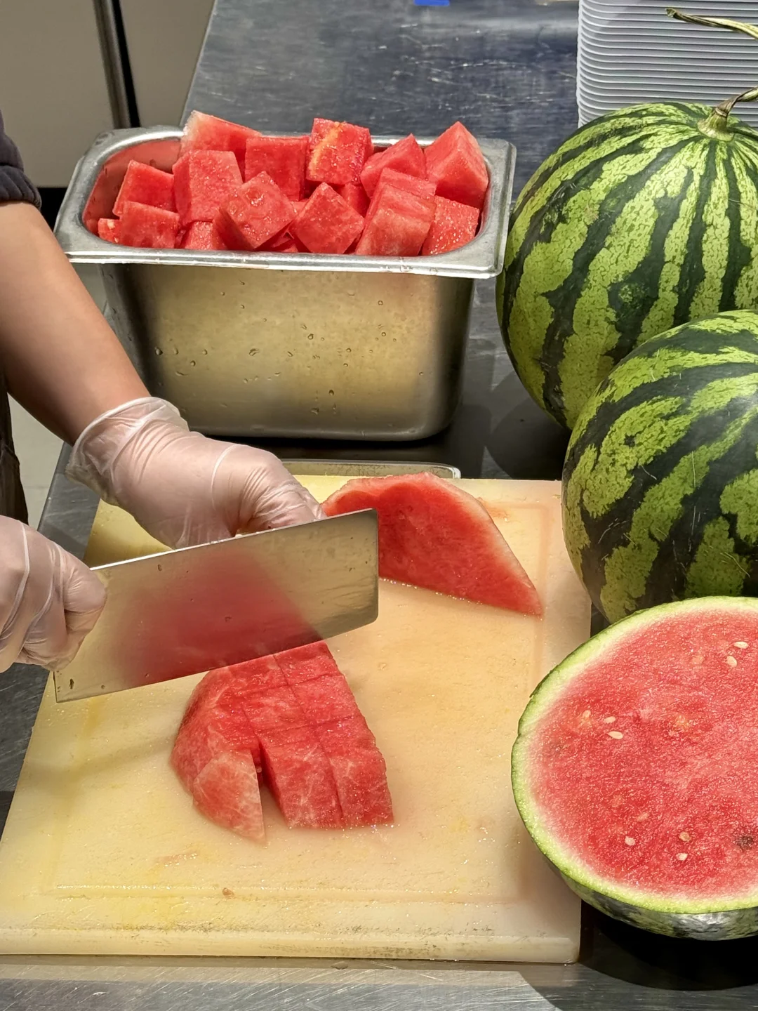 看着店员切水果,用料也太实在了!西瓜和不要钱似的,全是厚切🍉太得劲了!!!球球奶茶店都按这个标准卷,以后俺都不用去水果店了
