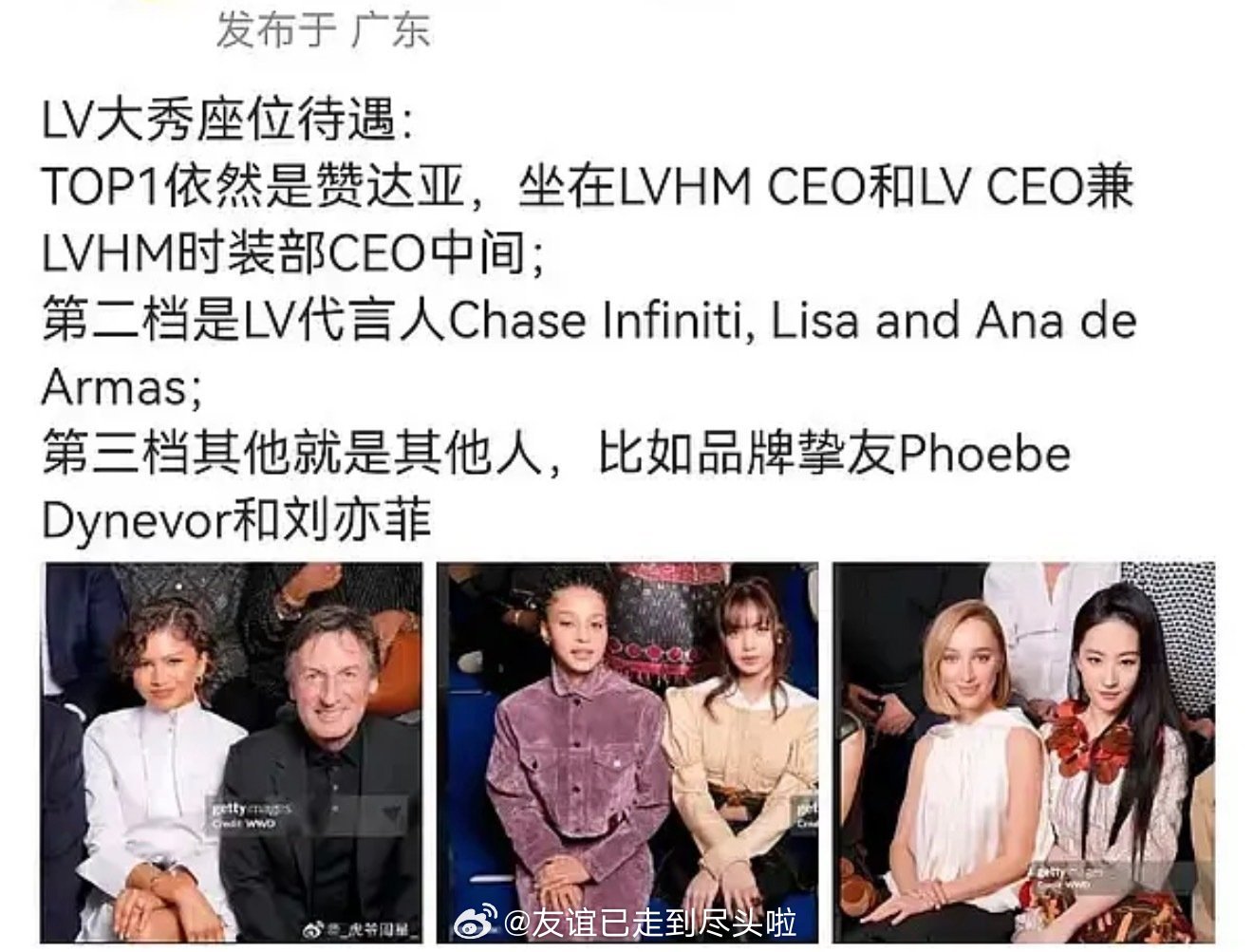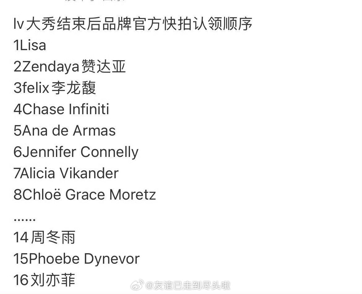 今年LV大秀内娱刘亦菲和周冬雨的待遇都一般,座位最好的是赞达亚,秀后品牌认领最快的是Lisa
