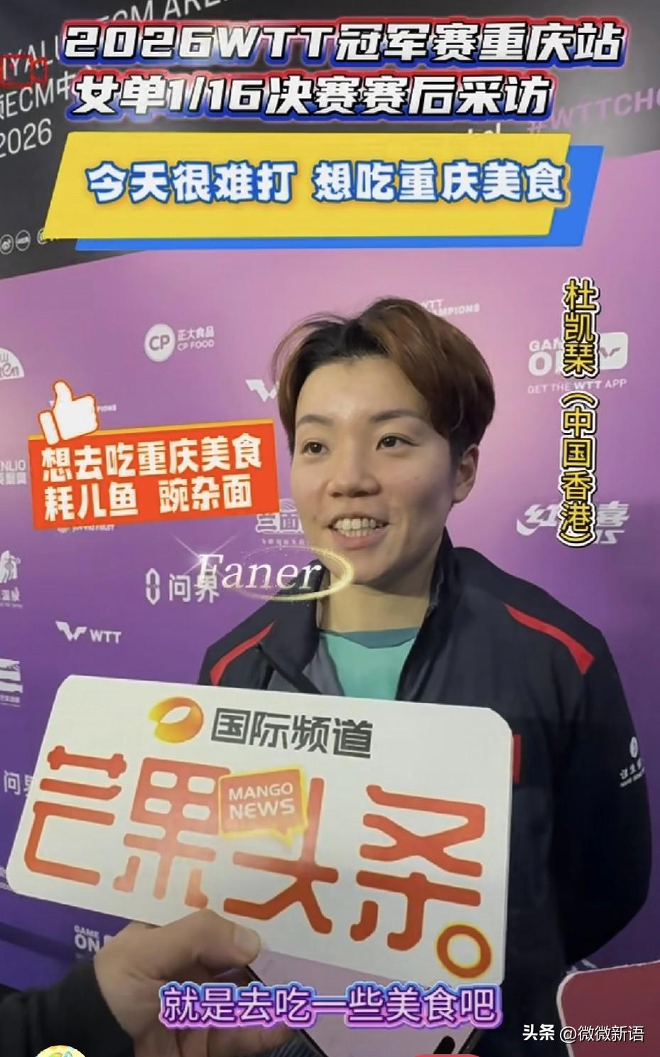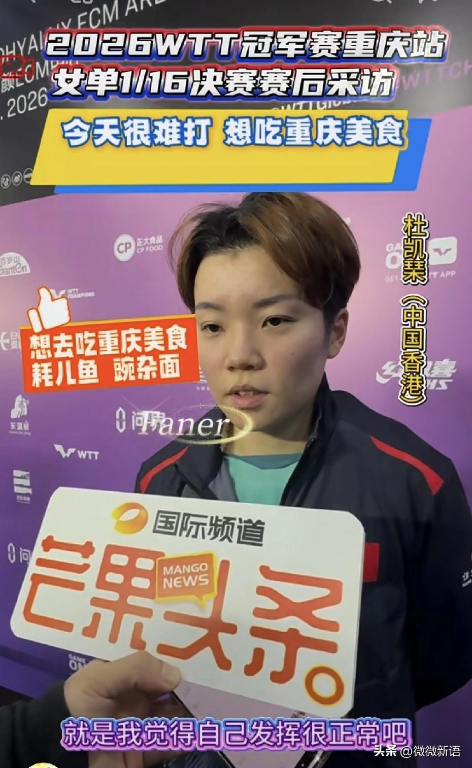 杜凯琹的心态是真的很好,在从香港来重庆的时候,她就说让大家给她推荐一些重庆美食。今天的比赛结束后,虽然杜凯琹输给了郑怡静,但是她也接受了采访,杜凯琹说话也是很温柔呢。 在采访中,杜凯琹说今天和静姐打,就是跟难打,觉得自己发挥还是很正常的吧。现在杜凯琹打比赛的心态很好,这次来重庆还可以和张瑞教练一起出去玩,她说还想出去吃耗儿鱼和豌杂面,虽然酒店的豌杂面也很好吃,但是还是想出去吃外面的。随后杜凯琹肯定也会更新在重庆吃到的美食,拿着球拍看世界,挺好的。还等着杜杜回到香港后和大圣一起拍段子呢,大圣说他要模仿欢哥。 外协球员很多来重庆比赛,来了大家就先去吃火锅了。昨天申裕斌赢了桥本后的采访中,申裕斌说她要去吃火锅,然后就是玩的开心,吃的好睡得好,她们的心态都很好呢,下一轮申裕斌对阵朱雨玲。