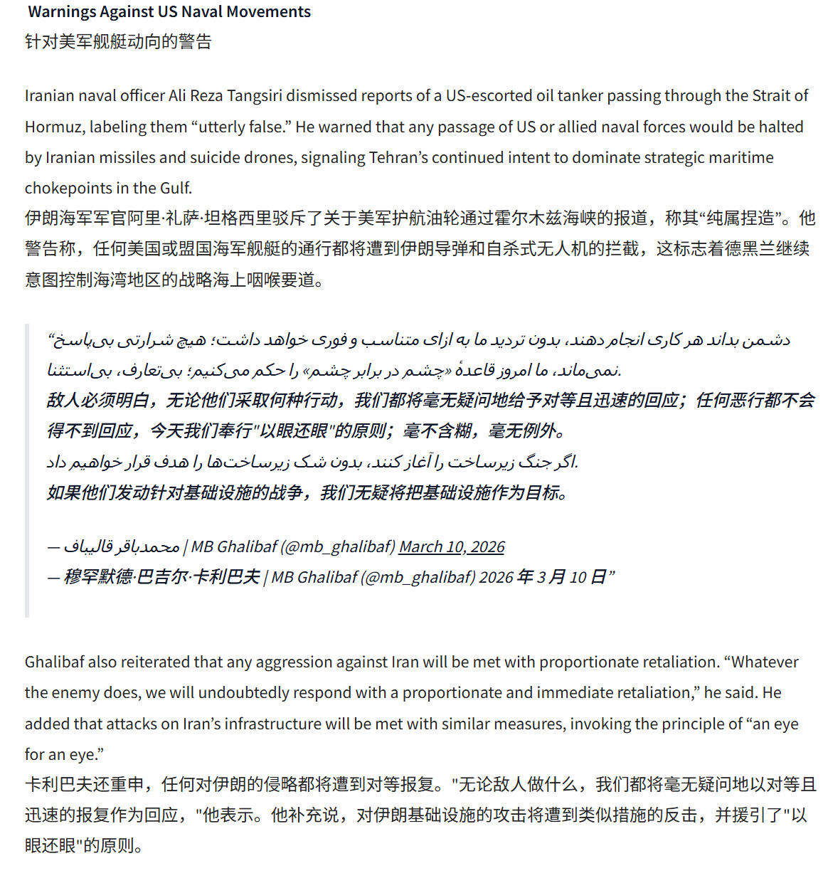 🔻伊朗外长阿巴斯·阿拉格奇说:“美国官员散布虚假消息以操控市场,但这并不能让他们免受由此引发的严重通货膨胀浪潮的冲击。市场正面临着史上最大规模的赤字危机,其规模远超阿拉伯石油禁运、伊朗革命以及科威特战争加在一起所造成的冲击。”🔻via pakistantoday伊朗总统之子称最高领袖平安伊朗下起毒雨海外新鲜事中东现场直击