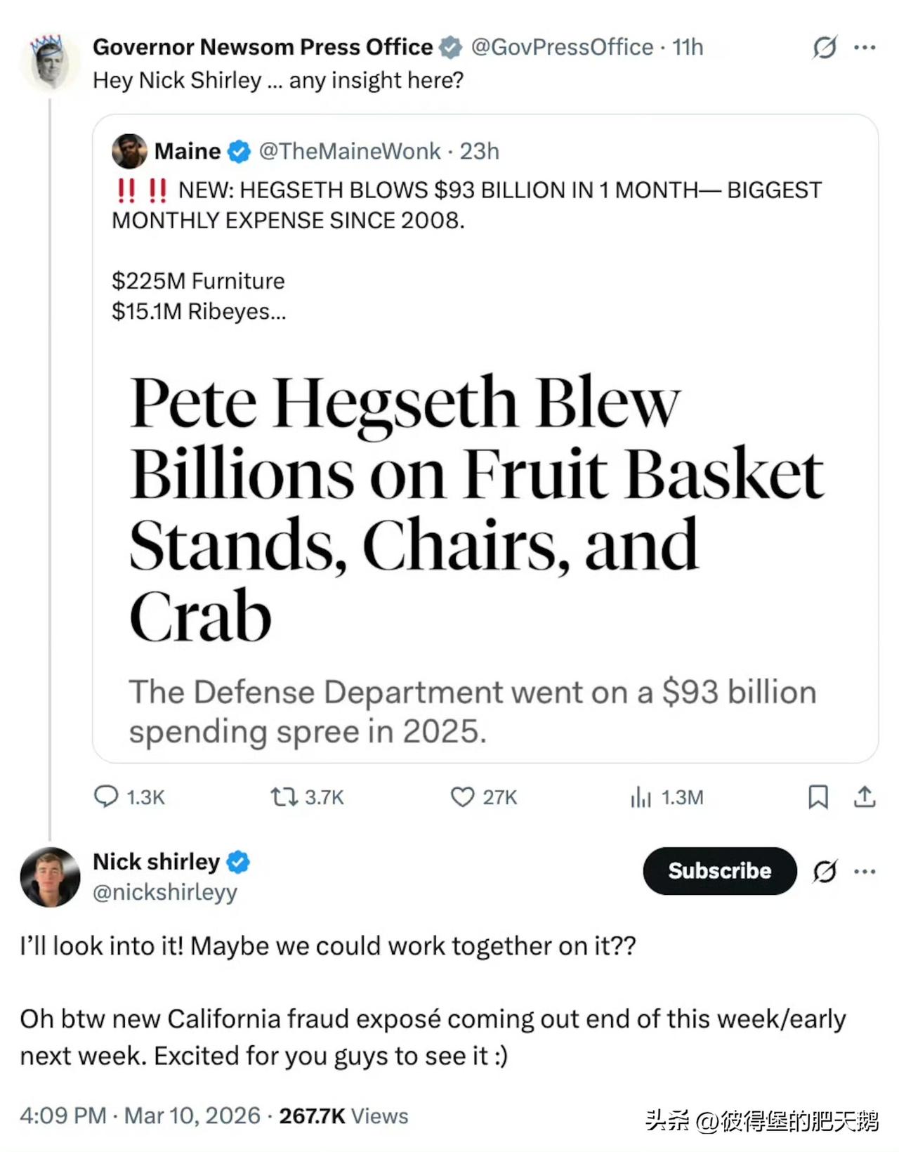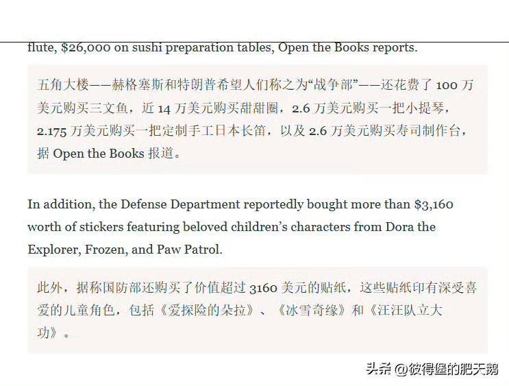 🔻纽森痛批"五角大楼皮特"挥霍龙虾牛排大餐。 🔻在伊朗战事正急之时,美国监督机构表示,五角大楼的挥霍行为至少是自 2008 年以来所有联邦机构中单月总额最大的一次。美国国防部在 2025 年 9 月(财政年度最后一个月)花费超过 930 亿美元,用于各类拨款、合同以及多种奢侈品采购。 🔻特色菜品包括龙虾尾、肋眼牛排和阿拉斯加帝王蟹,据报道五角大楼分别花费了 690 万美元、1510 万美元和 200 万美元采购这些食材,此外还有一架价值 98,329 美元的施坦威三角钢琴,是为空军参谋长家中购置的。 🔻挥霍还包括花费 12.4 万美元购买冰淇淋机、1.2 万多美元购买果篮以及 530 万美元购买 iPad 等苹果设备,花费 100 万美元购买三文鱼,近 14 万美元购买甜甜圈,2.6 万美元购买一把小提琴,2.175 万美元定制手工日本长笛,以及 2.6 万美元购置寿司制作台。 🔻这些都被纽森制作进了一张 AI 图片,团团保卫/包围着赫格赛斯。 🔻此外,据称美国国防部还购买了价值超过 3160 美元的贴纸,这些贴纸印有深受喜爱的儿童角色,包括《爱探险的朵拉》、《冰雪奇缘》和《汪汪队立大功》。 🔻via 每日野兽 #曝美军方花900万美元买帝王蟹龙虾##海外新鲜事##中东现场直击#