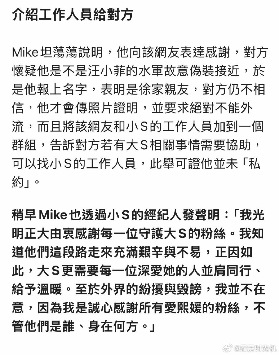 早前,许雅钧表示:“自己在1月关注到一个网友,一年来常常PO出对大s思念的动态,深受感动后私信对方“谢谢你支持大s”。因对方怀疑他是💦军他才传图证明身份,并且把该网友和小s工作人员拉了群组,并让对方有事可以联络小s工作人员。