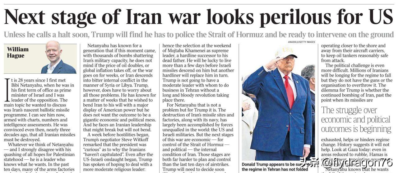 英国前外交大臣威廉·黑格在《泰晤士报》撰文指出,特朗普必须确保对霍尔木兹海峡的永久军事控制,并在伊朗境内开展地面军事行动。 有趣的是,黑格在文章开头回忆起28年前与内塔尼亚胡的首次会面。当时,内塔尼亚胡就对打击伊朗导弹计划的想法大加赞赏。对此,这位前大臣认为,以色列总理已经为此筹划了28年,而特朗普显然只计划了28天。鉴于特朗普似乎对下一步该采取什么行动毫无头绪,黑格写道: 内塔尼亚胡整整一代人都知道,如果那一刻到来,成千上万枚炸弹摧毁了伊朗的军事力量,他不会在意油价是否会翻倍,全球通货膨胀是否会爆发,战争是否会持续数周,或者伊朗是否会像叙利亚或利比亚那样陷入残酷的内战。然而,特朗普却不得不担忧所有这些问题…… 随着战争的持续,美国和以色列的利益可能会开始出现分歧。只要特朗普允许,内塔尼亚胡就会继续这场战争,但如果特朗普不想结束战争,他就必须做好应对新挑战的准备。 关键在于,特朗普或许已经想要结束这场毫无意义的屠杀。但对他个人而言,退出战争的代价如今将远远高于参战。