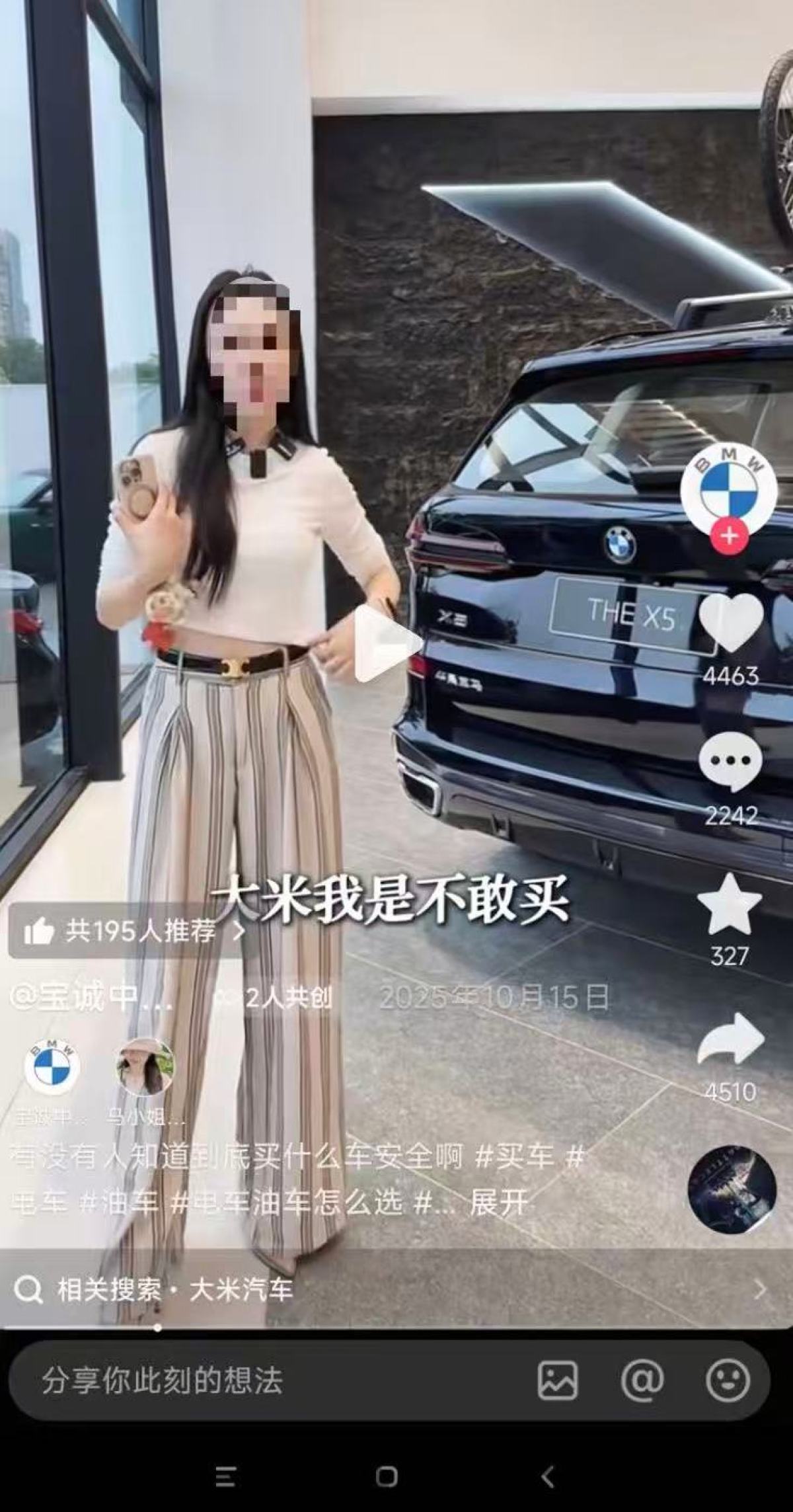 记者注意到,该条视频是由@宝诚中环上海宝马5S店和涉事主播个人短视频账号共创发布,发布时间显示为2025年10月15日。目前,争议视频已被删除。