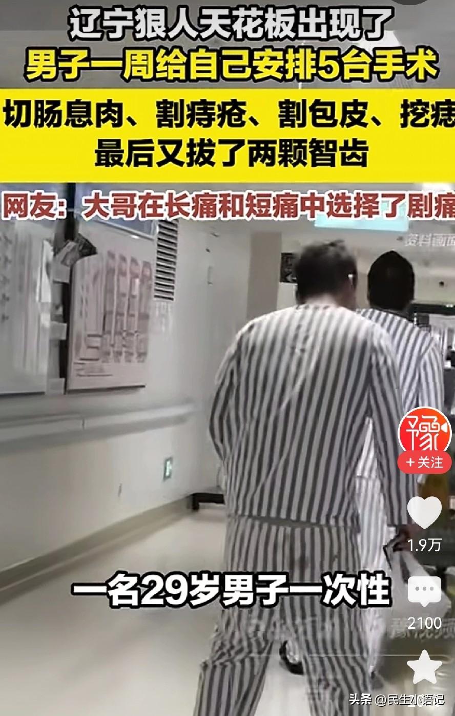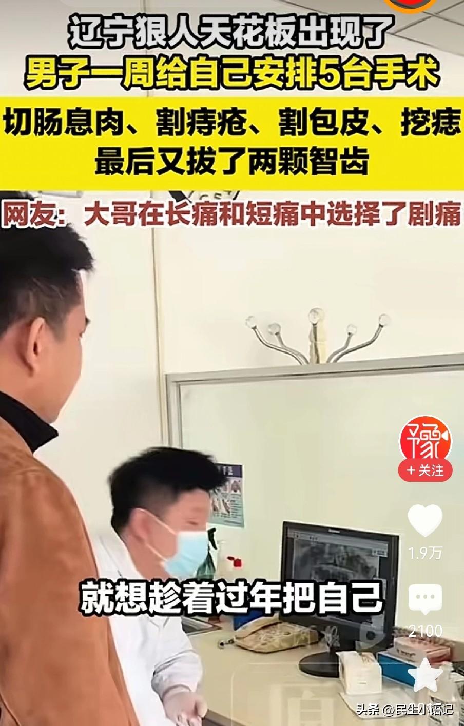 辽宁一狠人天花板级别的出现了,这个狠只对自己,29岁的男子给自己安排了一周五天的手术,在长痛不如短痛之间,他选择了剧痛。 近日,一男子趁着过年就给自己安排了狠活,把身体所有的毛病一次性给割除了,什么痔疮手术,拔智齿,割息肉,挖痣,甚至最后连包皮手术也安排上了。 这一通操作下来,可谓是“从头割到尾”,痛也是真的痛,但网友看完都说:他好像有点道理! 大家神评分析: 割了痔疮,不能拉就不能吃,拔牙是对的。 肠子里没东西切息肉也是对的。 不吃饭没劲也不碰女人,切包皮也是对的,这人太聪明了,最后再去去痣,完全又脱胎换骨了。 这哪里是手术,简直是一套“减肥+戒糖+养生”的终极组合拳! 虽然过程看着疼,但为了身体健康,这决心确实让人佩服。 不得不说,这哥们是真懂自我管理,把痛在当下、赢在未来贯彻得明明白白。 你觉得这波“全身大扫除”操作,是真勇士还是自虐狂?毕竟这左一刀又一刀的,实属普通人不敢想的。