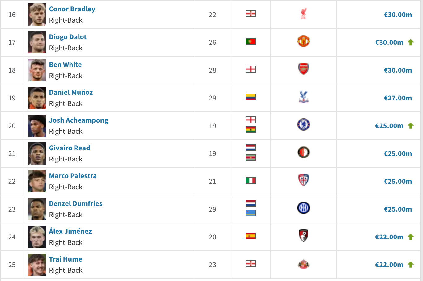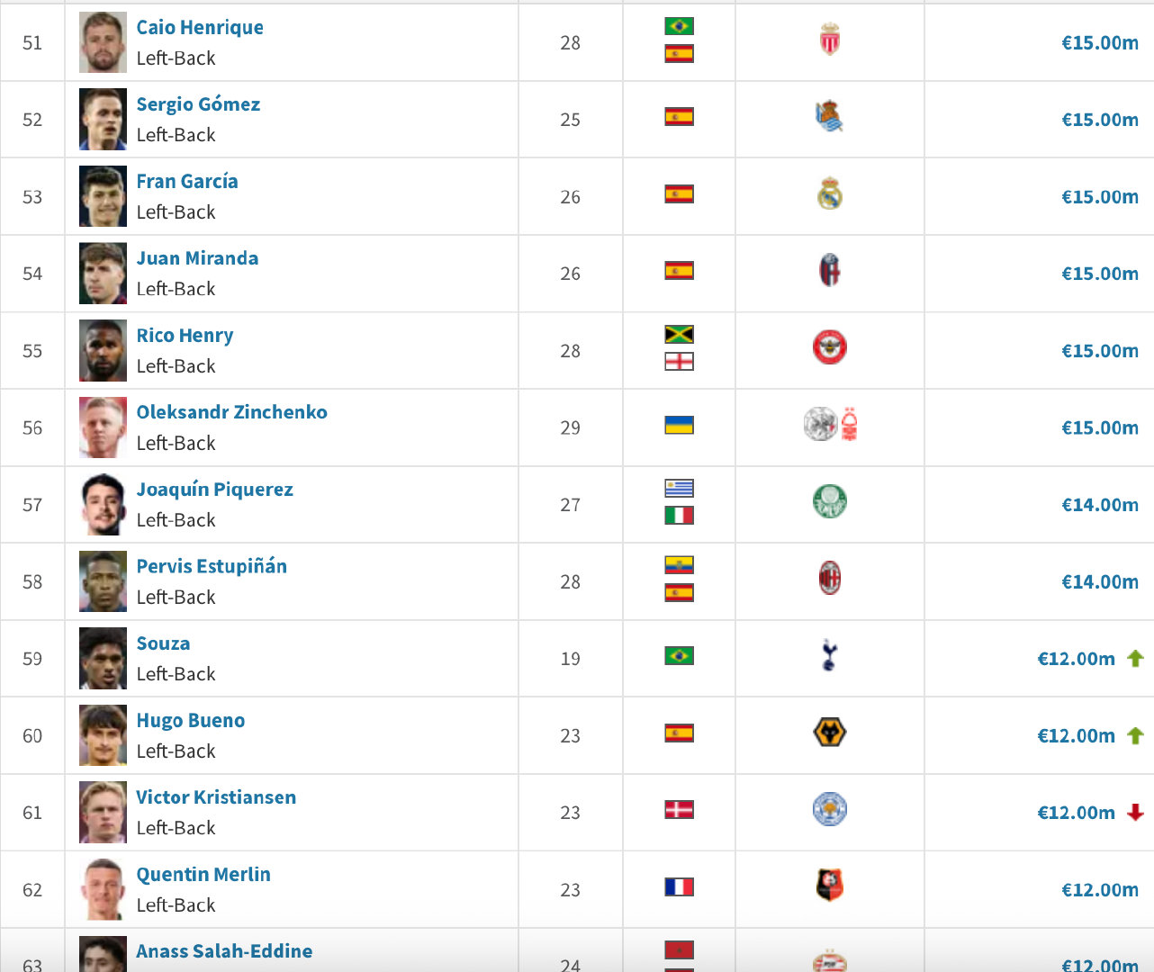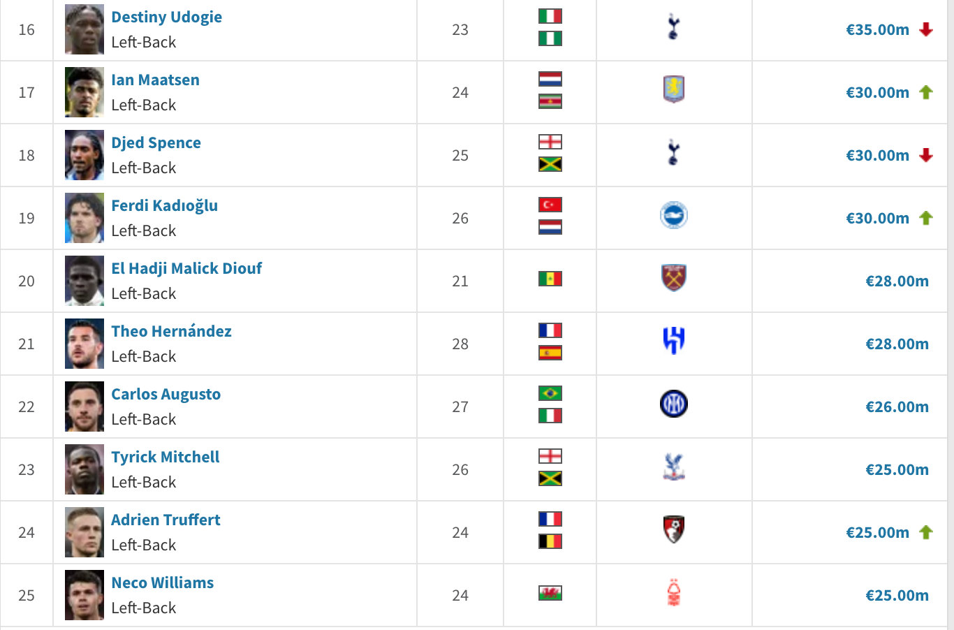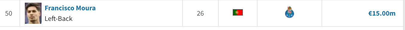 意甲联赛 以下是目前身价15M-30M价位的左边、右边卫,各位请上眼。德转没有边翼卫的选项,考虑到适配性,看着人多实际也没几个。估计最后名单还是老几位,乌多吉、帕莱斯特拉、大杜埃、万比萨卡之类的。