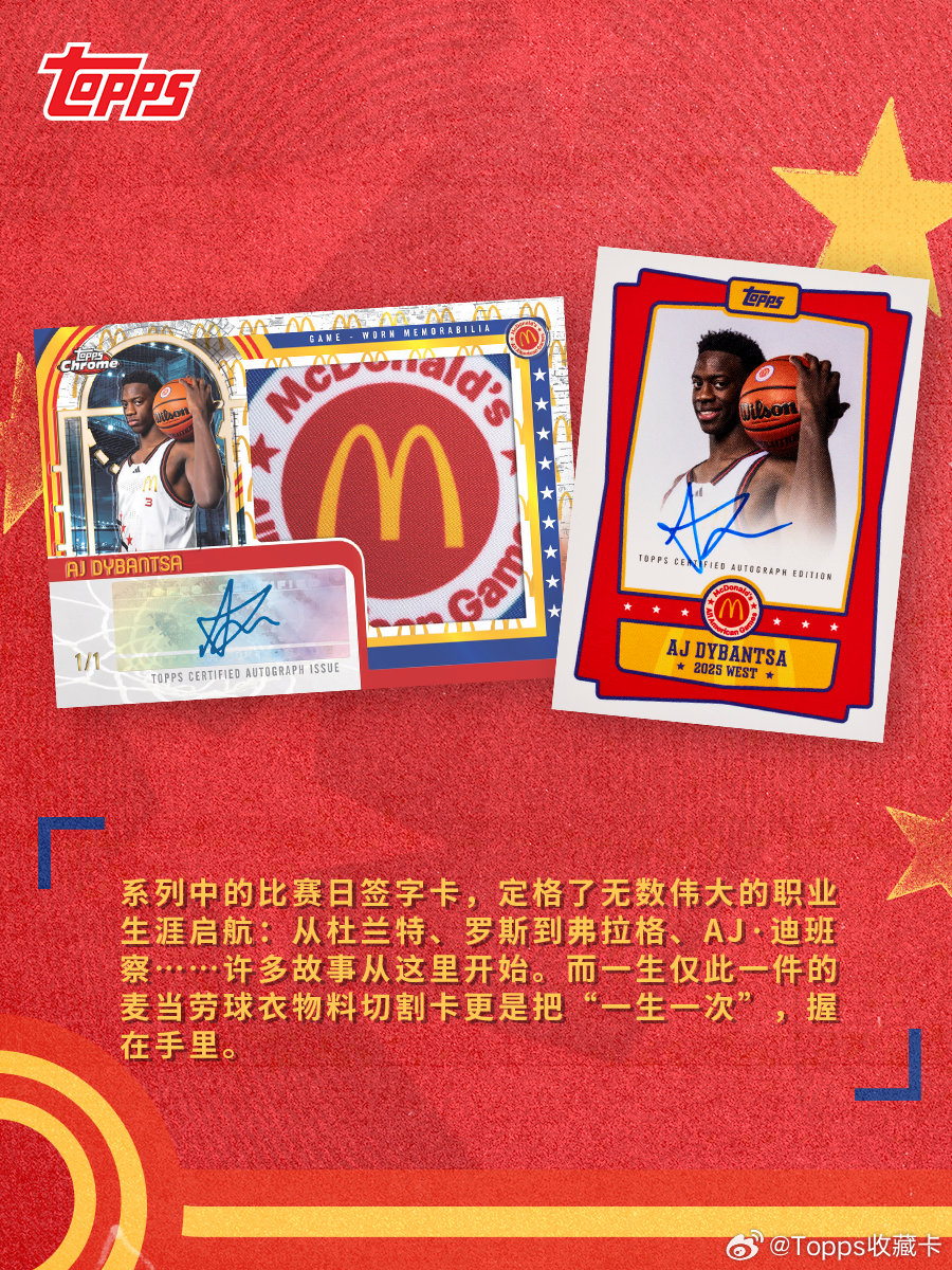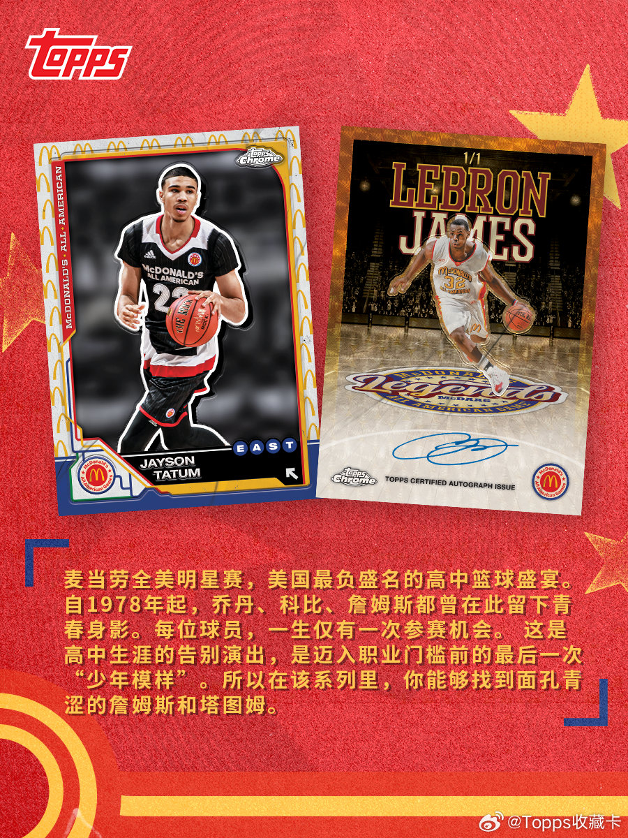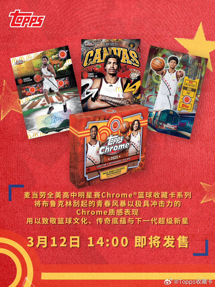 ⏳ 1978年至今,麦当劳全美明星赛见证了无数传奇的起点。🏀 乔丹、科比、詹姆斯,都曾以少年模样站上这片赛场——一生仅此一次的机会,然后奔赴各自的伟大。✍️ 如今,Topps Chrome把这份“青春限定”收进方寸之间:比赛日签字记录生涯第一笔,球衣物料切割把唯一握在手里。每一个细节,都在致敬那段从高中赛场通往传奇的路。📆 3月12日14:00,青春开箱回想一下你的高中,那时候的你,有没有过一个 NBA 梦?