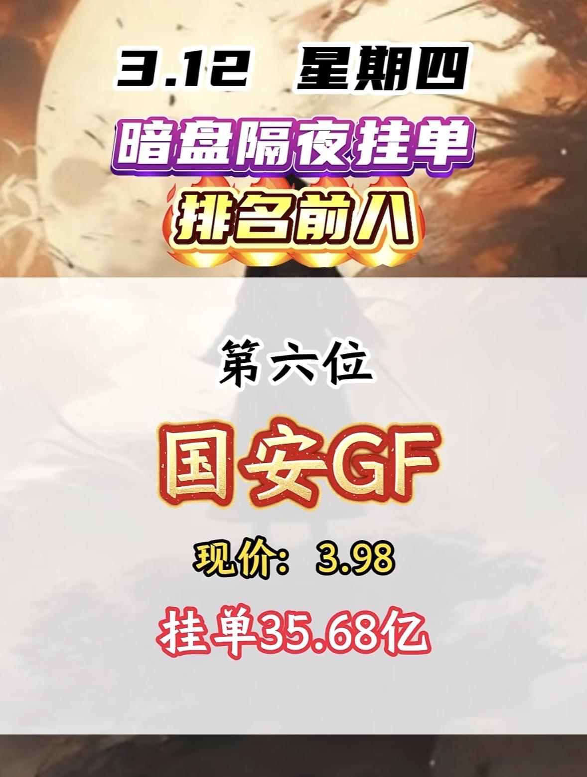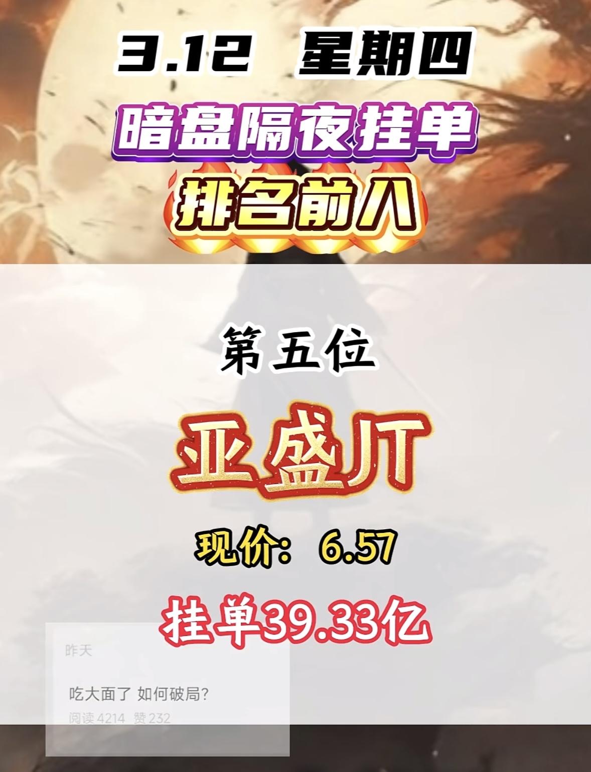 3月12日暗盘隔夜挂单揭晓 顺纳股份这情况有点意思。昨天它还是第五名,现价17.66,买单73.84亿,今天排名掉到了第八,现价变成17.87,挂单24.16亿。