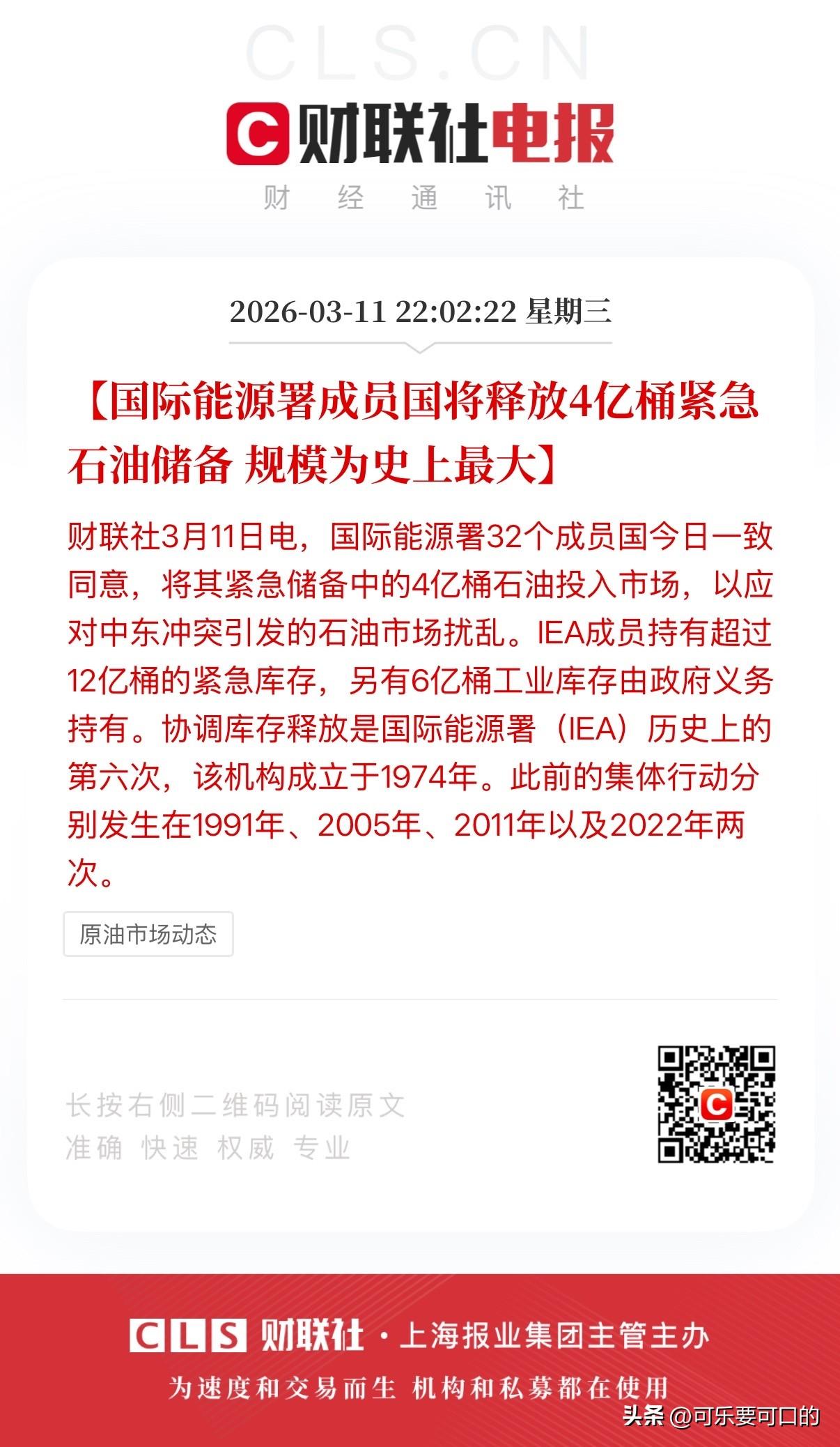 冲突这就结束了? 就在刚刚,老特称波斯境内“几乎已无可打击的目标”,对波斯的军事行动“即将结束”! 与此同时,传了一天的国际能源署计划释放石油储备的消息也终于实锤了,国际能源署32个成员国一致同意释放4亿桶紧急石油储备,规模为历史之最! 但是出人意料的是,石油期货却在短线跳水后又迅速拉回! 所以说这究竟是个什么情况?市场难道不信?