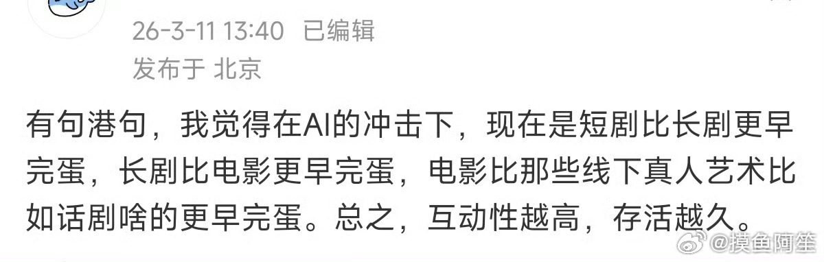 都很有道理……中国人太多,最近这些年发展出来的线下娱乐活动也太多了,线下的脱口秀,喜剧,话剧,音乐剧,舞台剧甚至是剧本杀和帅哥美女游乐园npc或者一日店长,都是很难被ai取代,未来依然有市场的。但是与此同时线上的二线明星以下的艺人也是真的很难再红起来了,现有的娱乐圈可能会很久不会大换血了。现在在娱乐圈大红的艺人。真的是在末日前登上诺亚方舟的幸运儿