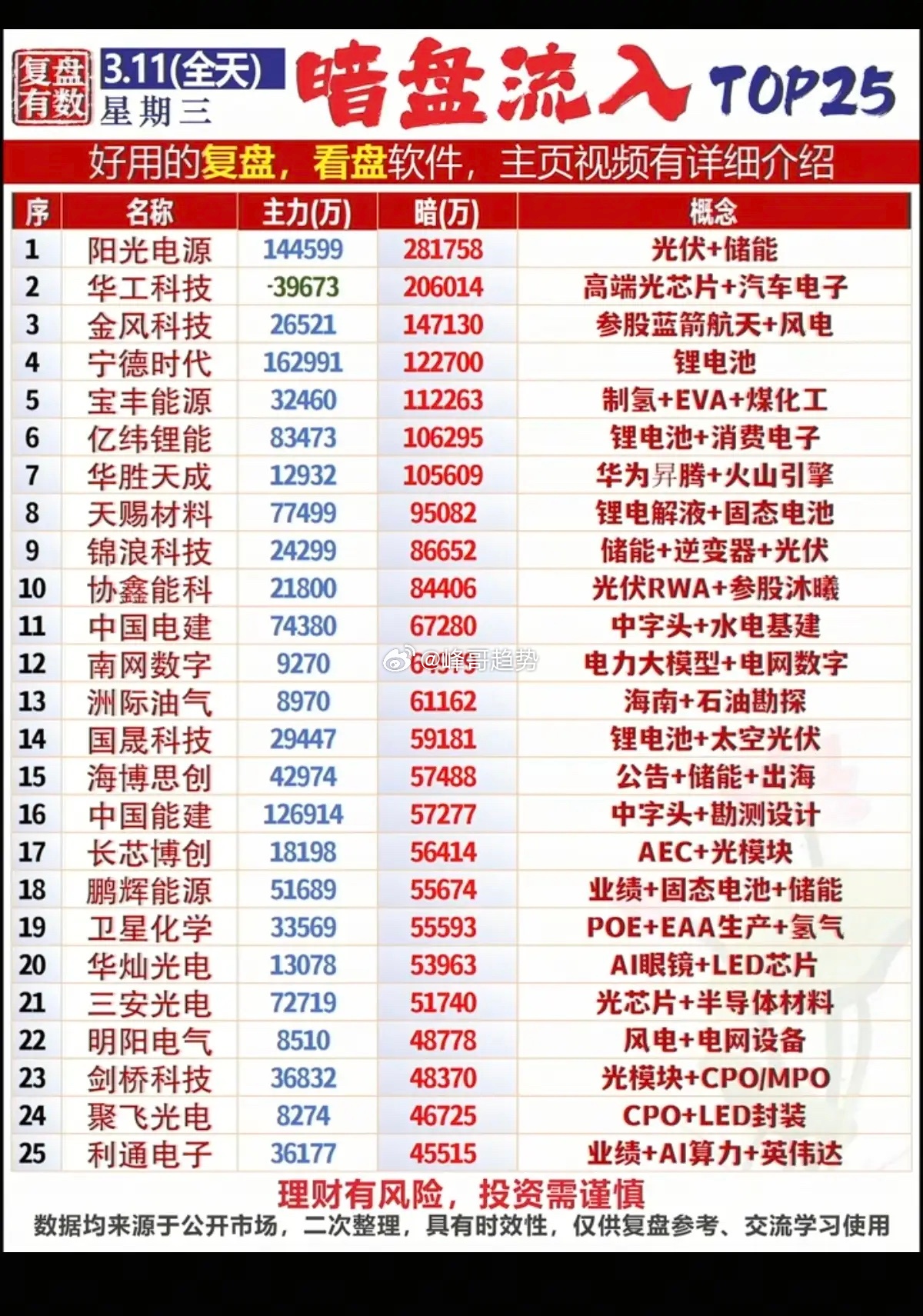 3月12日暗盘流入TOP25可是投资风向标!早盘主力暗盘流入情况很有看头。像