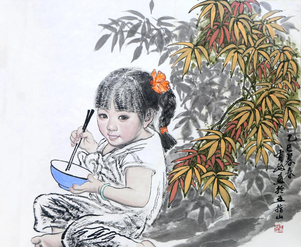 在陕北黄土高原的窑洞院落里,一幅画把祖孙三代的瞬间温情定格:奶奶慈祥低头,妈妈温柔哺乳,小孩抬头望奶奶,那一刻奶奶妈妈都爱我的,直接戳中多少人内心最软的缺口——现代快节奏下,多少孩子从小缺失这种三代同堂的贴身宠爱? 画家王有政扎根黄土塬野几十年,脚步踩遍沟壑梁峁、窑洞场院,硬是把那些转瞬即逝的生活碎片捞出来,变成一幅幅有温度的画面。像《奶奶妈妈都爱我》里,脚边随意扔着的锄头镰刀、豆子篮子,处处透着农家日常的烟火气,却偏偏把亲情烘托得格外浓烈。没有大场面轰轰烈烈,就靠这些最普通的物件和神态,勾勒出中国式家庭最本真的依靠链条。 再看他的其他作品,《夏风》里小姑娘扶着碾台,嘴角欲笑还休,身后盆栽仙人掌层层叠叠生机勃勃;《山花》中小丫头发辫散落,篮子满载野花,天真俏皮到让人心痒;《午饭小憩》里娃娃握筷嬉戏,饭碗空了还舍不得走。这些画面抓的都是孩子最放松、最无忧的刹那,背景草木藤蔓、碾盘老树,全是黄土高原的真实模样,却画出了超越现实的暖意。 王有政的厉害之处在于,他没靠符号堆砌乡愁,也没故意渲染苦难,而是用中西融合的笔墨,直接传递血脉里的温度。枯润线条写出老人皱纹的沟壑,孩童脚踝的泥点,衣服褶皱的弹性,这些细节堆叠起来,就成了对乡土生活最实在的礼赞。在城市化浪潮冲刷下,这种三代亲密、泥土沾身的童年记忆,正变得越来越稀缺,他的画像一面镜子,照出很多人内心藏着的乡土眷恋和亲情饥渴。 如今黄土画派第二代代表,他把“一手伸向传统,一手伸向生活”做到极致,不玩宏大叙事,却让平凡日常有了永恒的重量。看他的画,总觉得心被轻轻拽回那个有奶奶妈妈围着的黄土院子,那份踏实,现代人再有钱也买不回来。