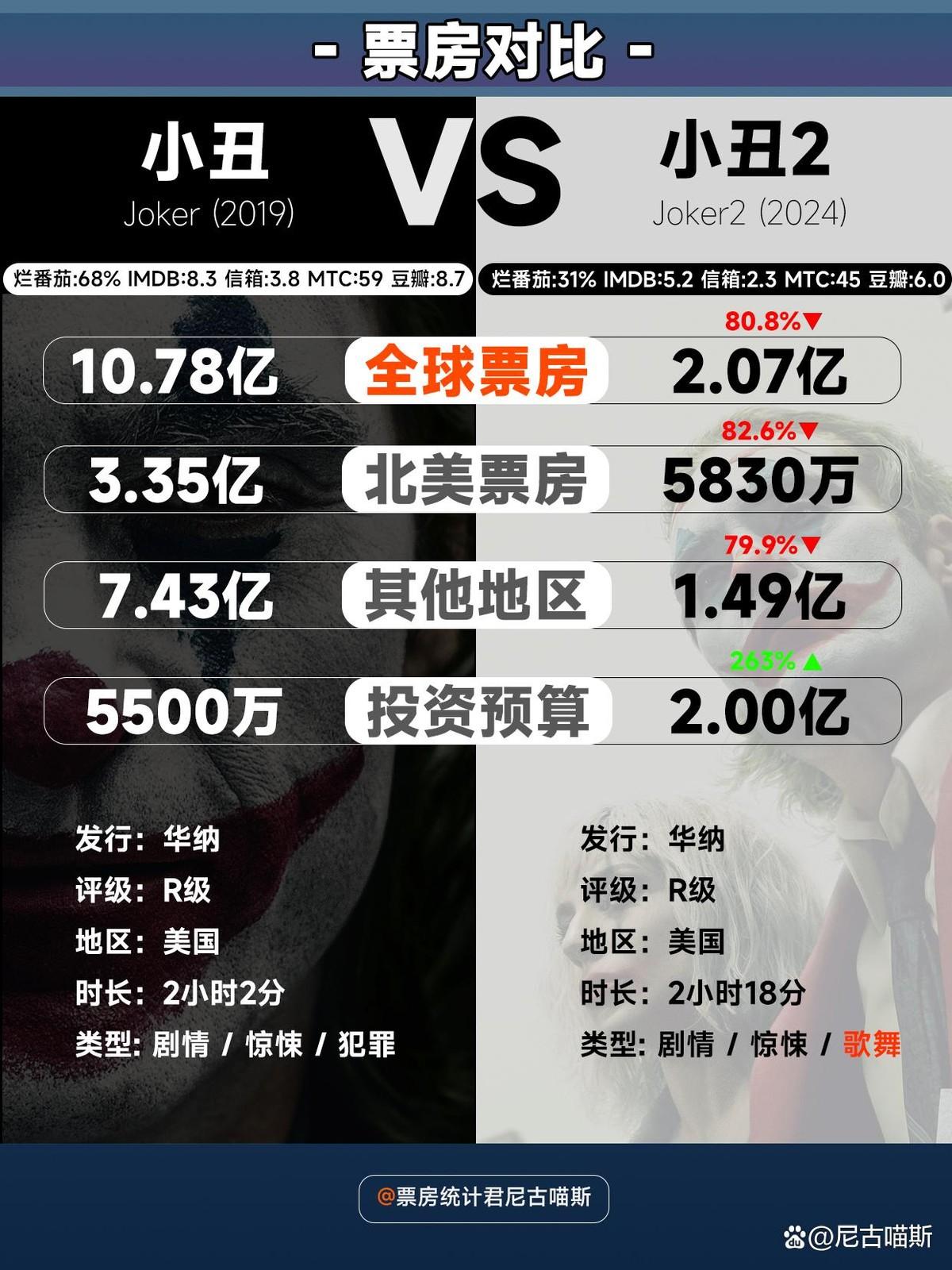 《小丑2》全球票房2.07亿美元。 相比前作,暴跌了80.8%。 2019年,《小丑》拿下了10.78亿。 2024年,续集只拿到2.07亿。 中间差了将近8.71个亿。 这个跌幅,比《爱丽丝梦游仙境》第二部跌得还狠。 为什么? 是续集拍得太烂吗? 或许不是。 问题在于,我们当初看第一部时,究竟在看什么。 2019年,那个穿着廉价西装、在台阶上跳舞的亚瑟,他不是一个漫画反派。 他是无数人心里那点无处安放的愤怒、孤独和格格不入的化身。 那部电影撞上了一个特殊的时刻,它成了某种情绪的出口,一个被过度解读的神话。 到了2024年。 他们给神话拍了个续集,还加上了歌舞和爱情。 观众走进影院,期待的是一场同样的精神献祭,看到的却是一场风格迥异的表演。 这感觉就像什么? 你满心期待地打开那部“神作”的第二季。 看了十分钟,手指已经不由自主地滑向了手机屏幕。 心里有个声音在问:这还是同一个故事吗? 数字不会说谎。 80.8%的跌幅,冰冷的8.71亿美元差额。 这不是一部电影的失败账本。 这是一场集体期待的精准落空。 当一部作品被捧上神坛,成为某种不可复制的象征时。 它的续集就已经输在了起跑线上。 它要对抗的从来不是平庸,而是观众自己亲手筑起的那座完美纪念碑。 任何试图坐回那个“完美位置”的努力。 都注定会显得笨拙而多余。