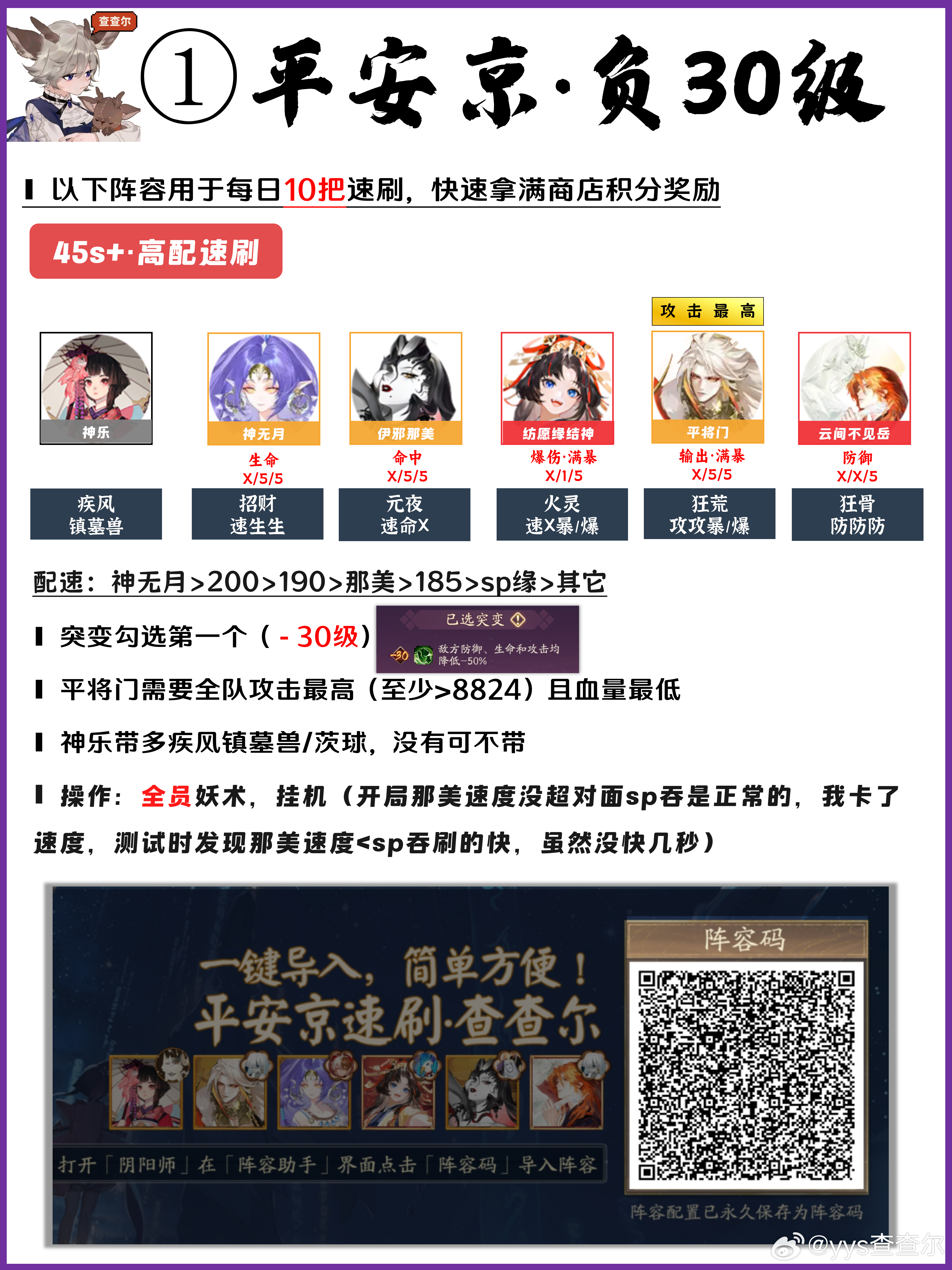 阴阳师手游超话创作官acg优创官 【妖行试炼】平安京,day9~10,速刷+低保+44级最高等级冲榜攻略!■活动时间:3.4~3.13(10天)文字码: 平安京45s+速刷(负30级)|TA|3cd547bc2ce6074f8445d1721479087e 兔季(负30级、20级突变通用)|TA|5841def5a3143fc4b4cb60b5ae6ecc15 平安京44级突变冲榜|TA|391cf7c6d597a308349308ef97e8a380