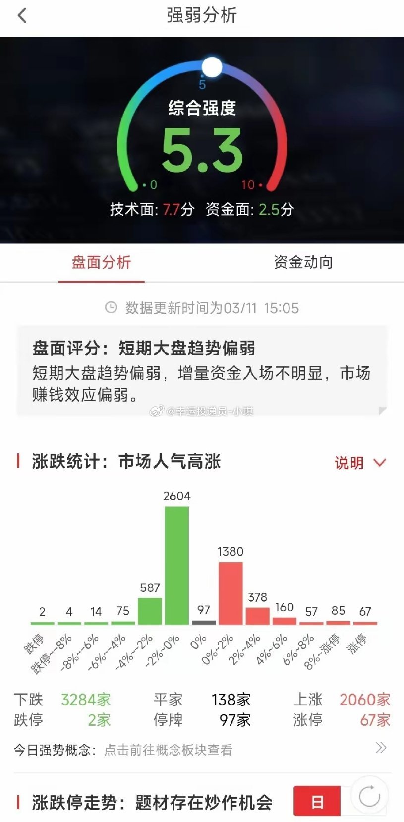 2026年3月11日股市高度4板:宁波建工(高开)3板:中南文化(一字)2板:瑞斯康达(一字),鼎信通讯(高开),祥龙电业(高开),华电能源(高开),黄河旋风(高开),国安股份(一字),绿发电力(高开)今日股市收涨,成交量2.5万亿,增量1114亿,上涨个股2060家,下跌个股3284家,涨停个股67家,跌停个股2家,连板票9家,今日市场震荡,我今天操作很差,虽然没亏钱,但是很郁闷,被主力耍的团团转,反思自己,提高认知,明天吃大肉,加油朋友们!