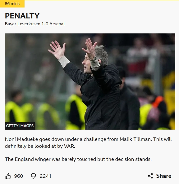 在BBC的直播间中,对这个点球的判罚描述为:马杜埃凯在与蒂尔曼的对抗中倒地,这肯定会由视频裁判进行审查。英格兰边锋几乎没受到任何接触,但判罚维持不变。
