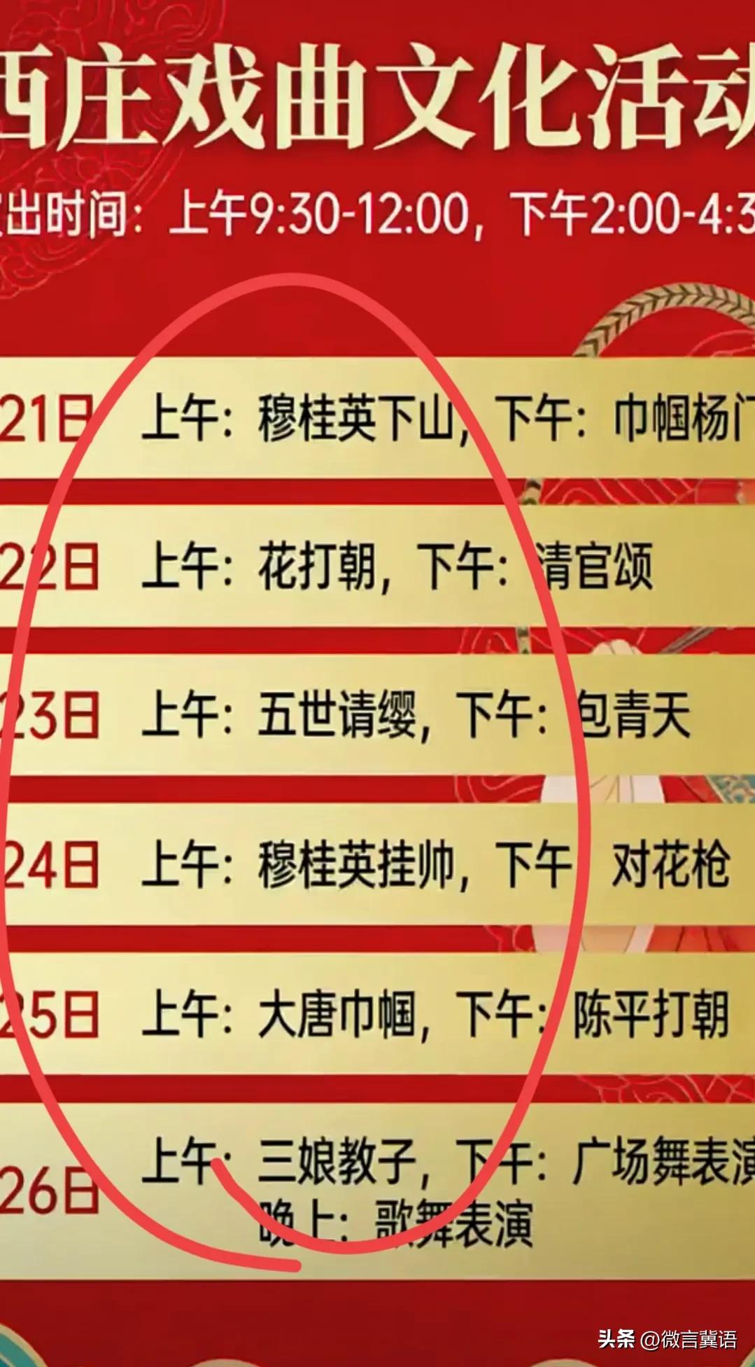 【灵寿燕川,免费大锅菜!】石家庄灵寿县南燕川乡西庄村,正月二十一,连续唱戏6天,还有歌舞。这么近,那么美,西庄看戏不后悔!看着像是有免费大锅菜!快来吧! 石家庄,现在是越来越好了!老百姓的戏曲文化生活越来越丰富多彩! 灵寿燕川的本次戏曲文化活动的演出时间为:上午9:30-12:00,下午2:00-4:30! 1,正月21日 上午:穆桂英下山,下午:巾帼杨 2,正月22日 上午:花打朝,下午:清官颂 3,正月23日上午:五世请缨,下午:包青天 4,正月24日上午:穆桂英挂帅,下午:对花枪 5,正月25日 上午:大唐巾帼,下午:陈平打朝 6,正月26日 上午:三娘教子,下午:广场舞表演!晚上:歌舞表演 石家庄现在的文化娱乐活动真是精彩纷呈,不断丰富着老百姓的精神生活! 信息图片来源网络侵权联删