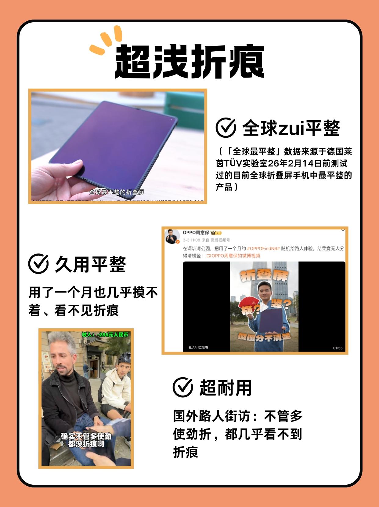但OPPO Find N6这次经过验证,不仅是莱茵认证全球zui平整的,而且用了一个月都几乎看不到折痕,甚至老外使劲多次折叠,OPPO Find N6都一样那么平整,是有点东西的。还有其它外围配置OPPO Find N6也没落下,详细可以看我做的汇总图。