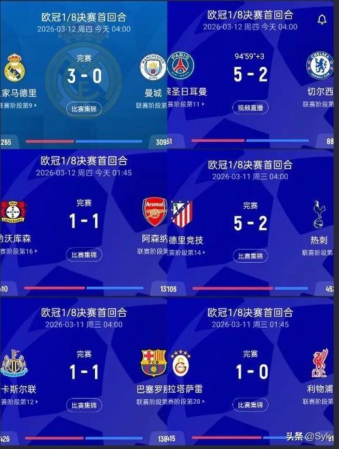 太拉跨了!欧冠英超6队全不胜,颜面尽失,次回合凶多吉少! 欧冠1/8决赛首回合,英超6队遭遇赛季最黑暗一夜,6战0胜、2平4负,堪称耻辱之夜。 利物浦0-1不敌加拉塔萨雷,狂攻无果,客场折戟; 纽卡1-1战平巴萨,主场作战却在补时被点球绝平,到手胜利飞走 ; 热刺2-5惨败马竞,防线崩盘,前景黯淡 ; 阿森纳1-1勒沃库森,靠89分钟点球绝平才勉强保住体面; 切尔西2-5被巴黎血洗,后防千疮百孔; 曼城0-3不敌皇马,卫冕冠军被彻底压制。 六队合计丢16球,作为世界第一联赛,此番表现严重失色。次回合均需客场作战,翻盘难度极大,英超球队在欧冠的处境岌岌可危,球迷失望之情溢于言表。