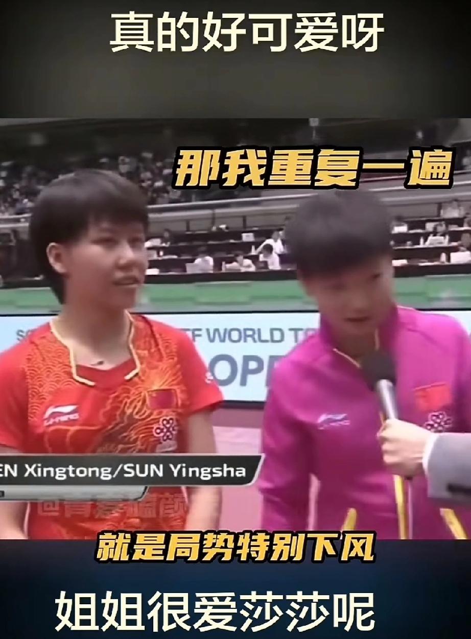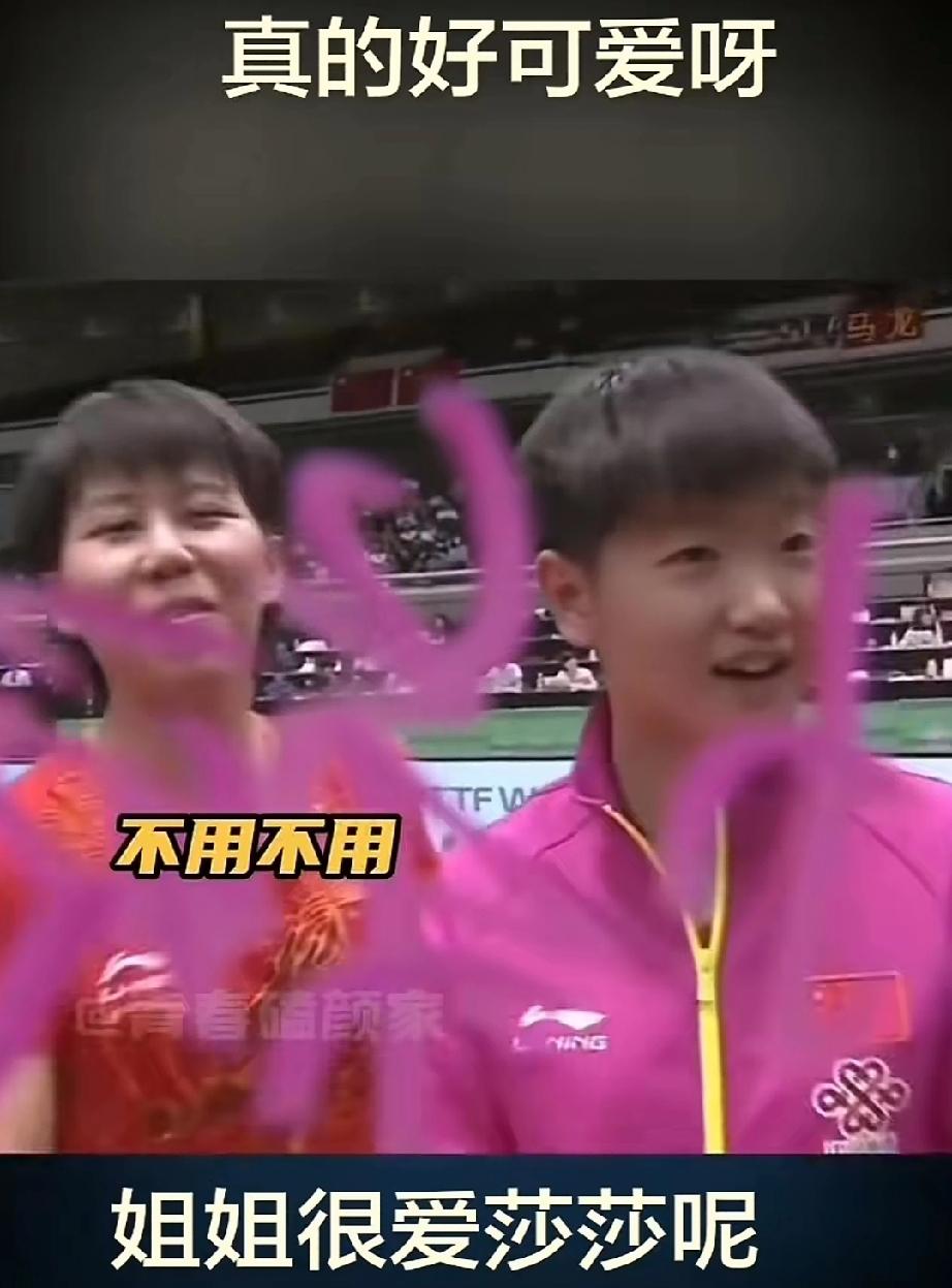 17岁的莎莎能有多可爱。 第一次获得成分组冠军,看着奖杯低着头,还很含蓄。散场后坐在椅子上东张西望。龙队就在旁边温暖的看着莎莎笑。莎莎转头看到龙队,开心的叫起来。 面对记者采访,还很懵不知道怎么开口,旁边陈幸同提醒她记着提问呢,要回答。莎莎才睁大眼睛回复问题。 当在镜头前让签名时,莎莎一再确认是不是在镜头前签字,确认后认认真真的签上“孙颖莎”三个子,结果把搭档陈幸同的名字落掉了。惹的同同笑起来。 这一波下来,真是懵懵懂懂,可可爱爱!