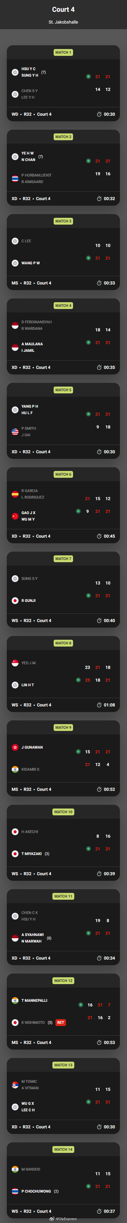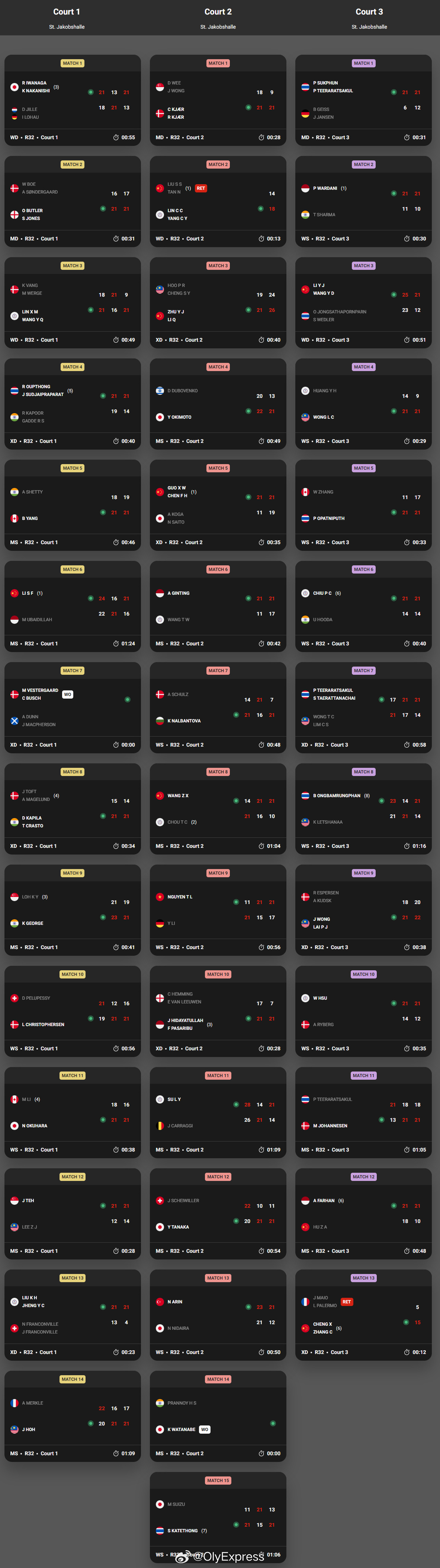 【瑞士赛11日国羽7胜2负】2026年瑞士羽毛球公开赛羽联超级赛 3月11日巴塞尔,2026世界羽联超级300瑞士公开赛结束第二比赛日,国羽7胜2负,国羽赛果如下,完全赛果见图:男单:李诗沣24-22/16-21/21-16乌拜迪拉(印尼)王正行14-21/21-16/21-10周天成(中国台北)胡哲安18-21/10-21法汉(印尼)女双:李怡婧/王漪朵25-23/21-12奥尼查/维德勒(泰国)刘圣书/谭宁(退赛)14-18林芷均/杨筑云(中国台北)混双:郭新娃/陈芳卉21-11/21-19古贺辉/斋藤夏(日本)朱一珺/李茜21-19/26-24许邦荣/钟舒韵(马来西亚)高家炫/吴梦莹9-21/21-15/21-12加西亚/罗德里戈兹(西班牙)程星/张驰15-5麦奥/帕勒默(法国,退赛)