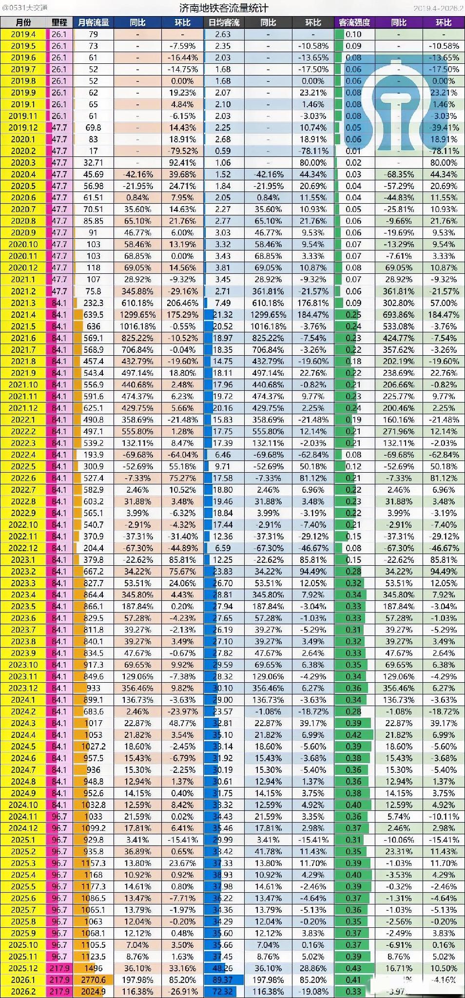 济南人的“地铁时代”来了! 2024年春节在2月,济南地铁的月度客流数据呈现明显季节性波动。据统计,1月济南地铁日均客流量为29万人次,而到了3月,这一数字攀升至32.81万人次,环比增长13%,显示出节后返工与城市活动恢复的强劲动力。若以1月总客流量89.37万人次(按日均29万估算)为基准,按13%增幅推算,3月总客流量有望突破101万人次,实现单月百万级跨越。 这一增长背后,是济南轨道交通网络的持续完善与城市活力的释放。2024年元旦假期,济南地铁线网客运量同比增长330.12%,单日最高达40.72万人次,反映出市民对地铁出行的依赖度显著提升。而春运期间,济南预计发送旅客830万人次,铁路、民航客流同比增幅均超40%,地铁作为城市交通“毛细血管”,有效承接了枢纽接驳与市内通勤需求。 从1月“春节前夕”到3月“全面复工”,济南地铁客流的V型反转,不仅是城市经济复苏的缩影,更为未来交通规划提供了数据支撑。随着更多线路的开通与运营服务的优化,济南地铁有望在2024年迈向更高客流台阶,为城市发展注入持久动能。