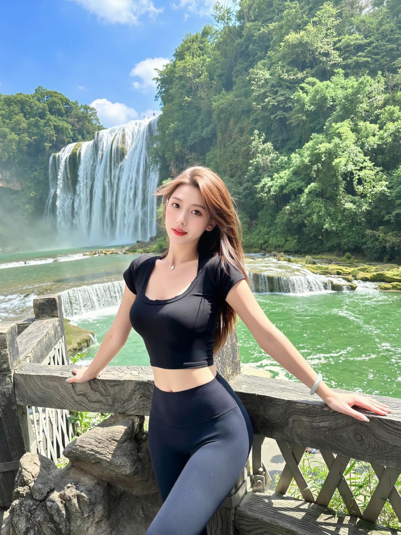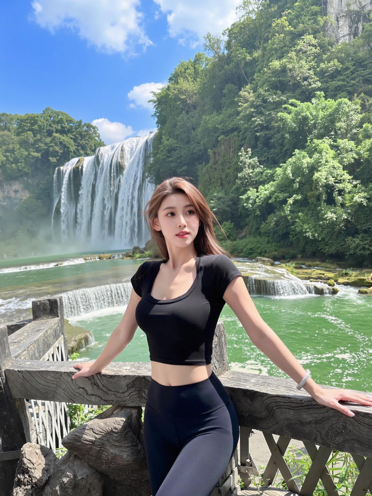 黑短T+瑜伽裤,户外逛山也能穿得很出片✨ 出来走一走就想穿得舒服又上镜。 黑U领短T修身不紧绷,高腰瑜伽裤包裹感很好,一身运动风,走久了也完全不累。 全黑超显利落,短款还特别拉高腰线。 站在瀑布和绿植旁边,整个人线条干净又精神,又酷又有活力。穿搭 瑜伽鲨鱼裤穿搭