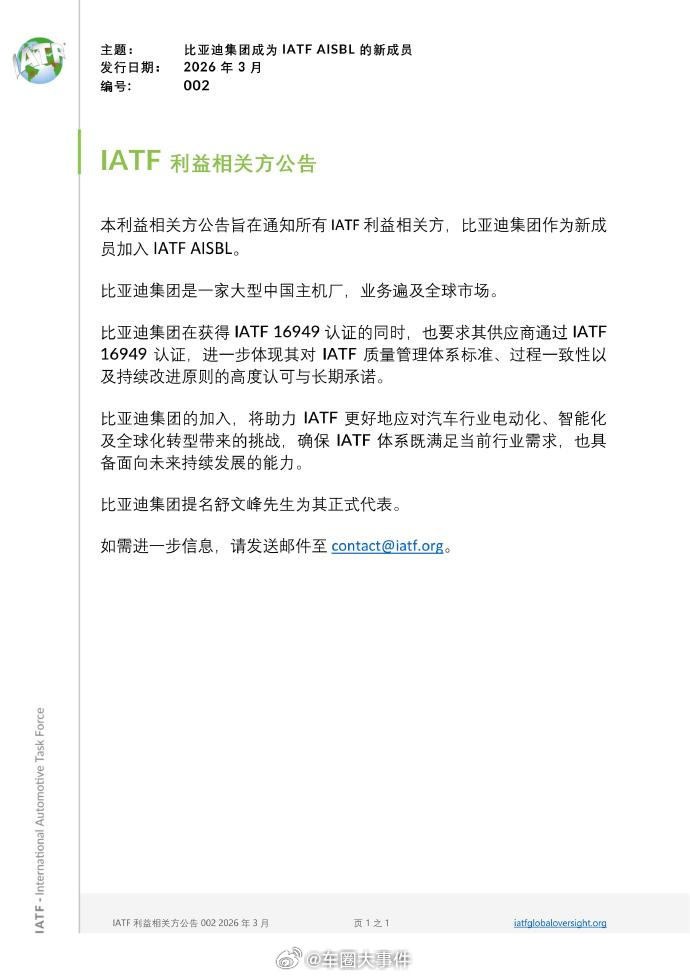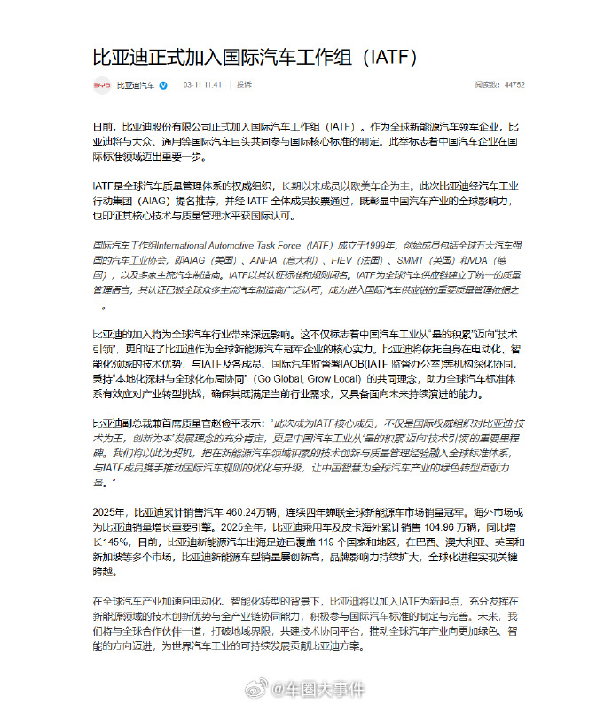 比亚迪宣布正式加入国际汽车工作组3月11日,官微宣布,比亚迪股份有限公司正式加入国际汽车工作组(IATF),成为 IATF AISBL 的新成员 ,将与大众、通用等国际汽车巨头共同参与国际核心标准的制定。