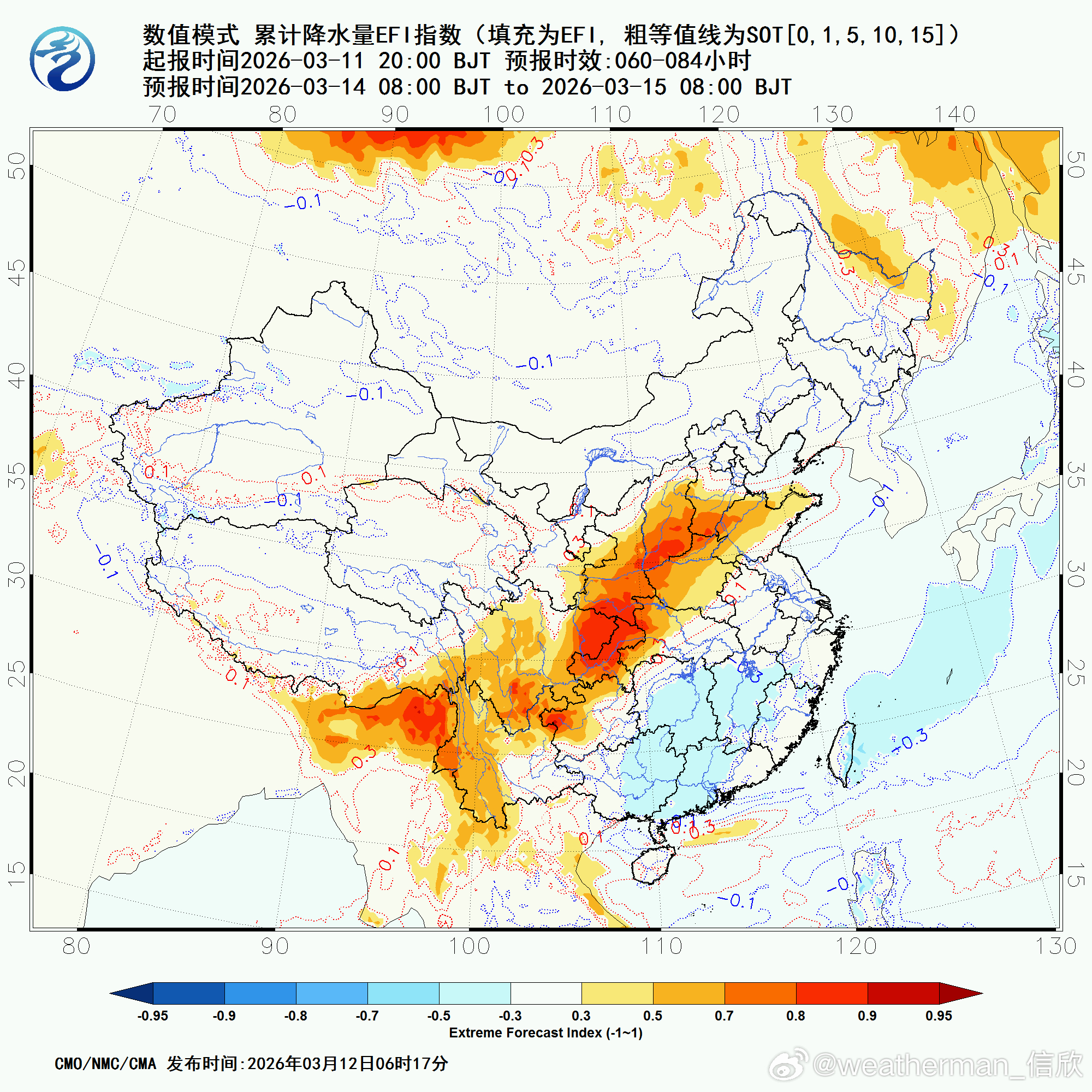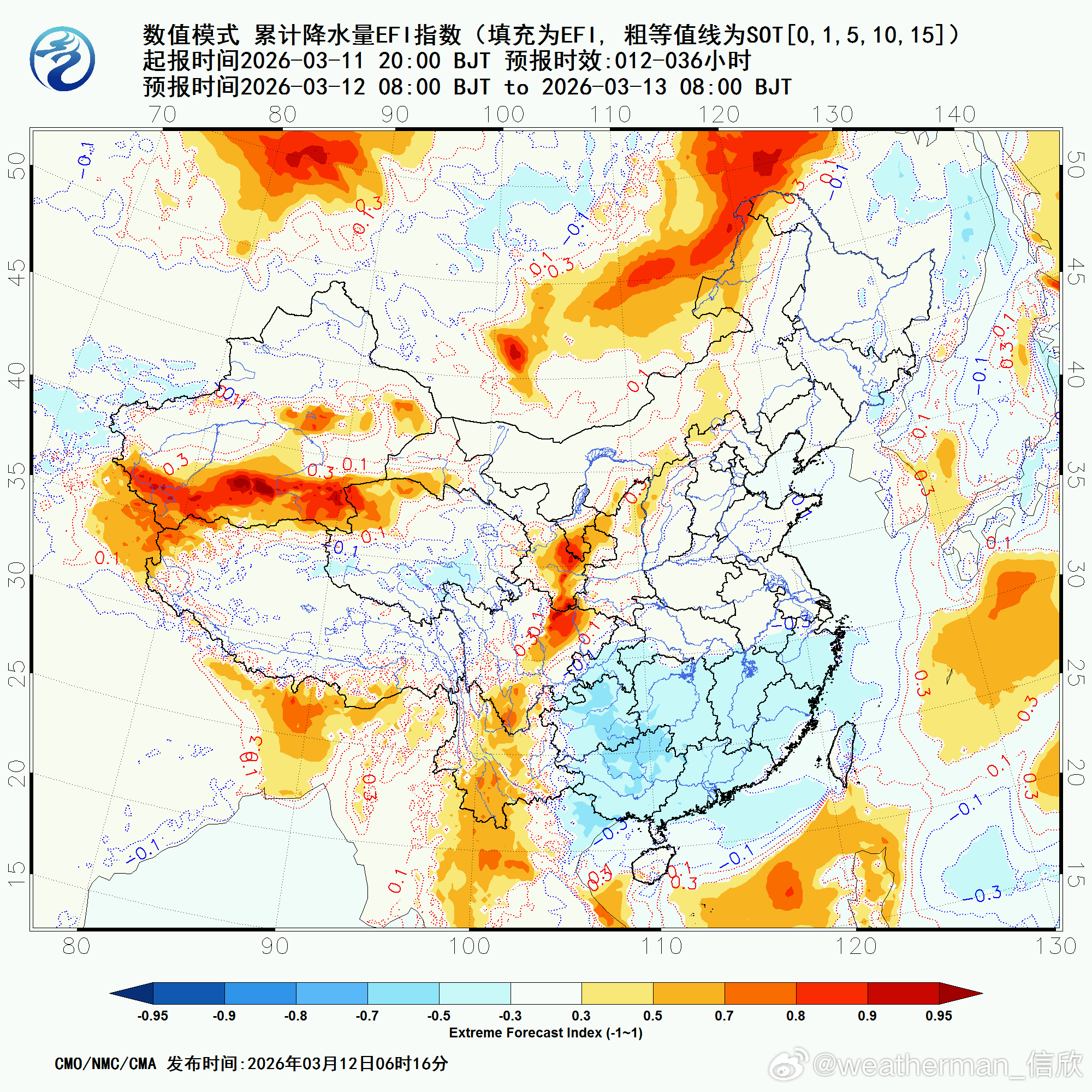 从降水的极端指数预报看,今天到明晨在新疆南部,明天白天到后天早晨在甘肃陕西四川三省交界一带,后天四川东北部一带的降水强度同期少见。另外13-14日甘肃宁夏陕西多地会有雨雪转换,降雪量存在变数,如果降温快于预期,转雪时间早,降雪强度还可能增加,反之降温慢于预期,转雪时间晚,降雪强度会不及预期。