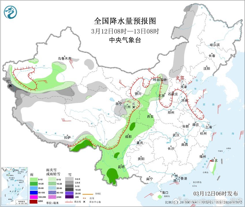 今后3天冷空气继续东移,暖湿气流也会北上,导致我国降水继续增多。西北地区、华北西部和北部、东北地区等地有小到中雪或雨夹雪,其中,13日至14日,青海东部和北部、甘肃东部和南部、陕西中南部、山西中南部等地部分地区有大到暴雪。西南地区东部、黄淮、江汉、江淮、江南西部及西藏东南部等地有小到中雨,局地大雨。