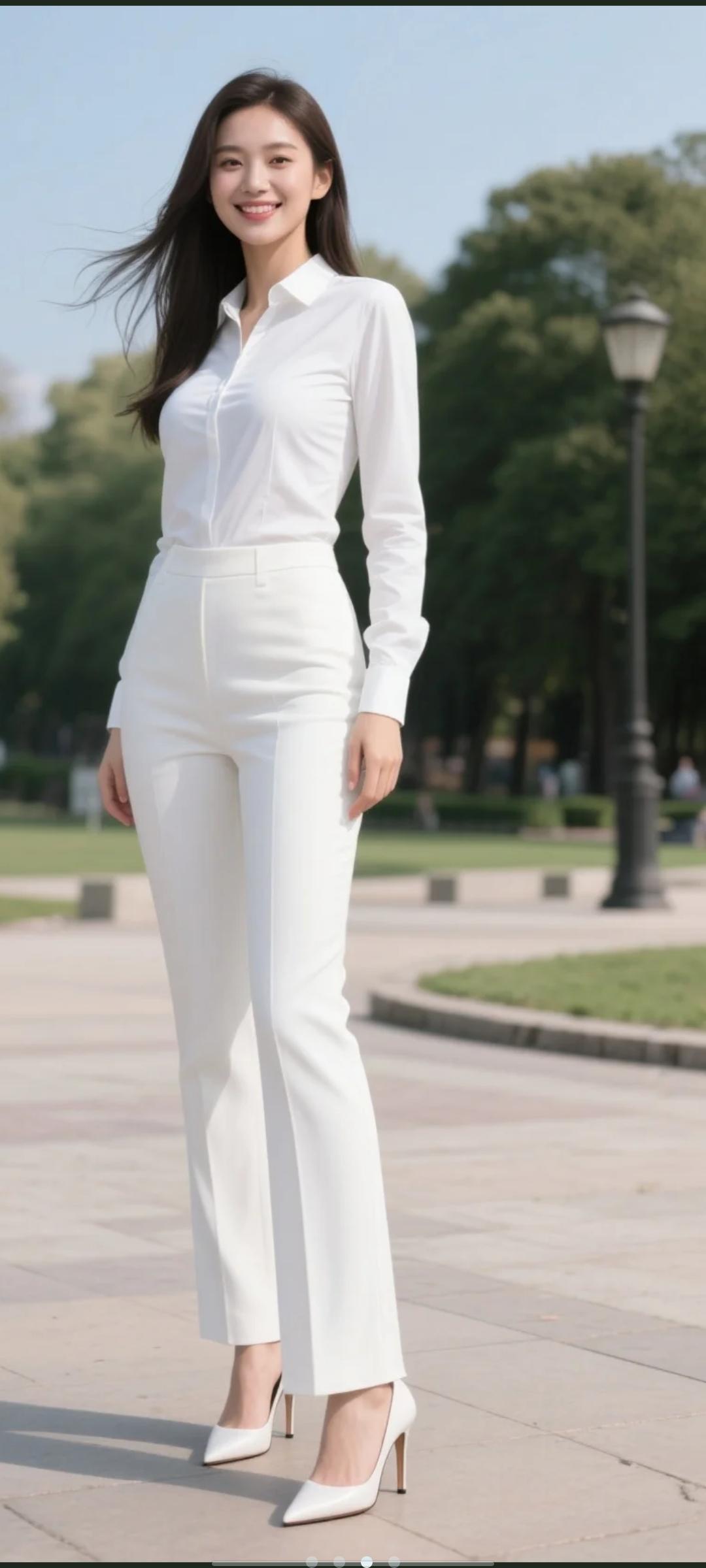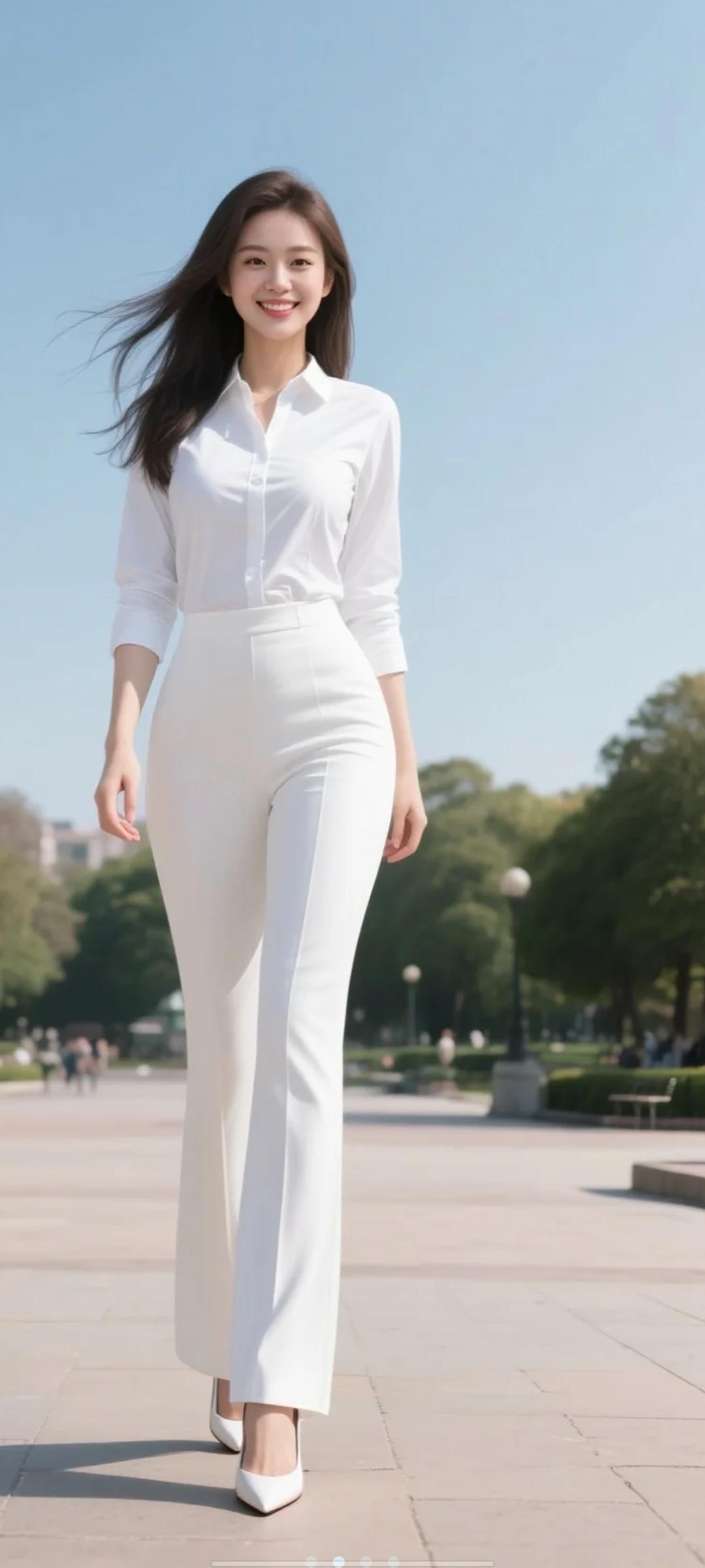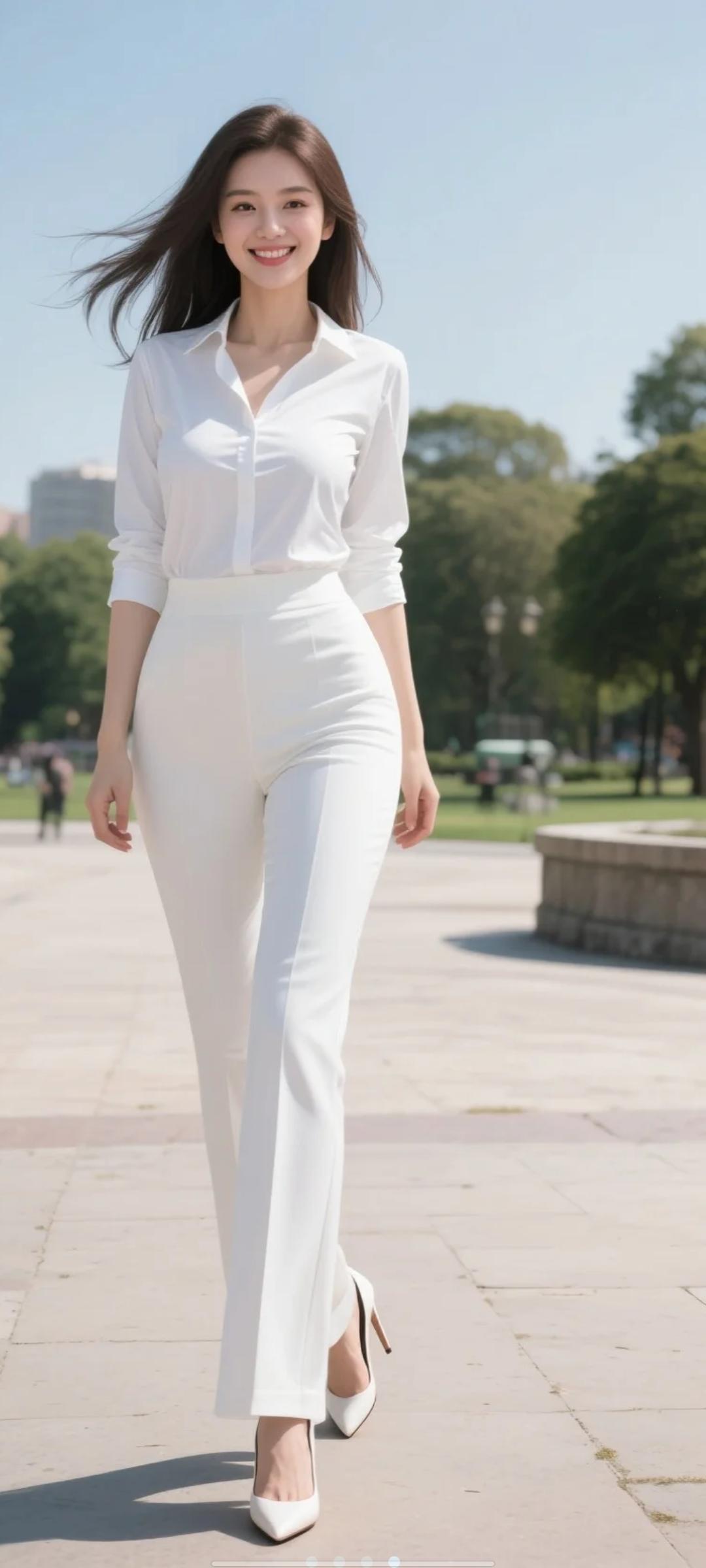 分享生活美好时刻大美女,紧身纯白色衬衫,同色紧身阔腿裤,同色尖头细跟高跟鞋,中长发随风飘散。背景公园广场,皮肤紧致细腻,身材优美,逼真的眼睛和面部细节,超写实,超高分辨率,32K最佳质量,杰作。绝色佳人,唯美,浅笑,高清图片,大师级摄影,全身随机照,正面,远景