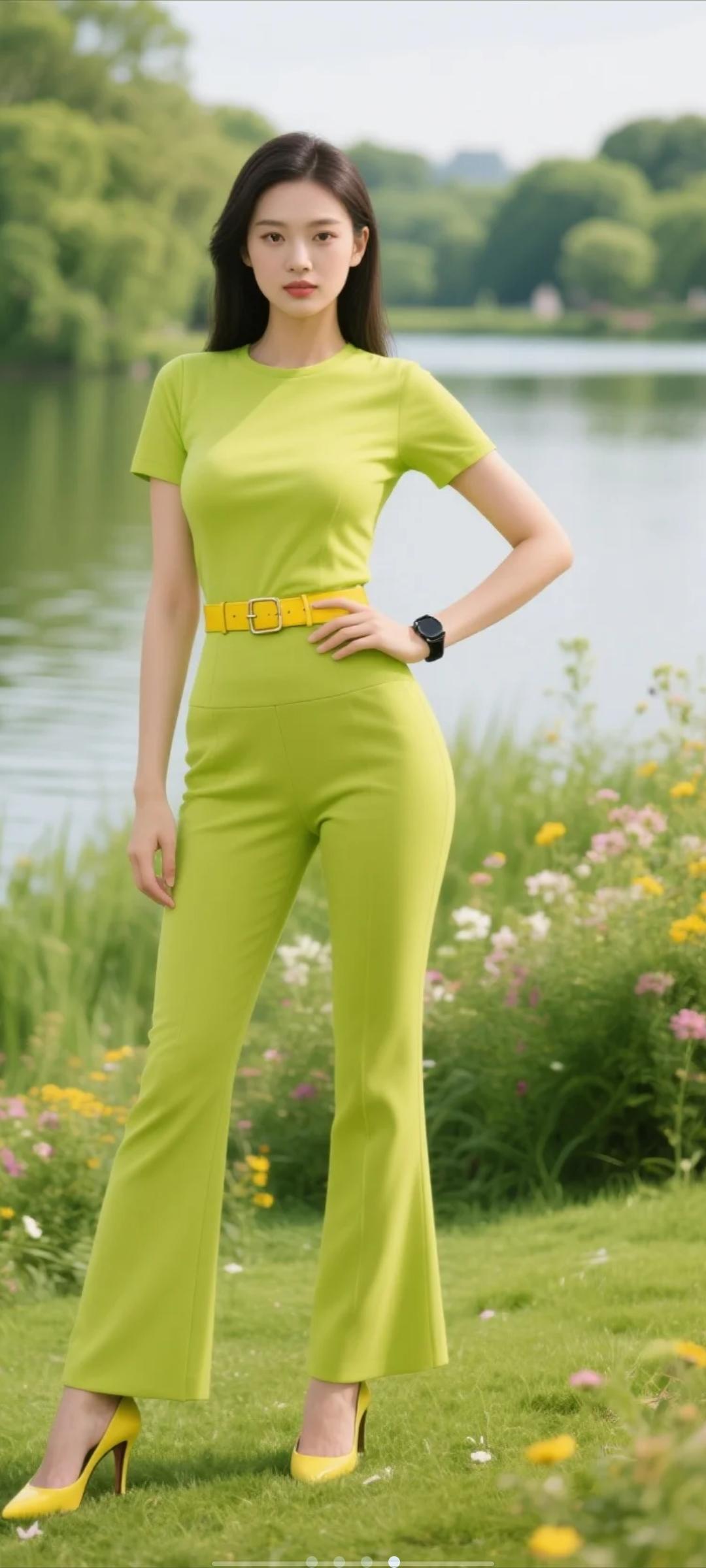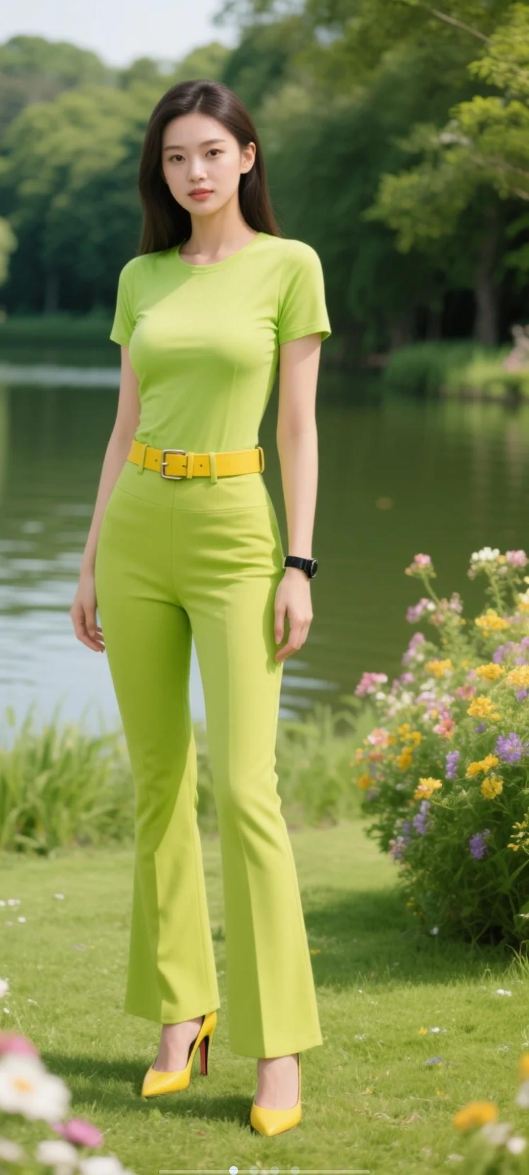 绝色礼仪小姐穿着紧身黄绿色短袖,搭配黄绿色修身微喇叭长裤,同色12厘米细跟高跟鞋,腰间系着黄色皮带,左手腕戴着一块黑色手表。她站在绿意盎然的湖边草地上,周围繁花似锦。正面全身照照,32K高清