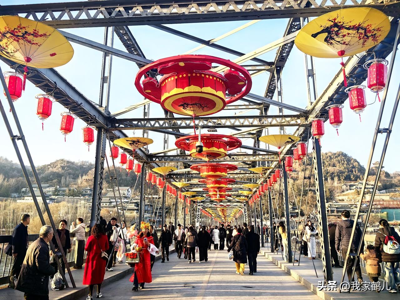 红灯笼挂满整个桥身,人们在桥上悠闲散步,好一派热闹祥和的景象。 甘肃文旅,以山河