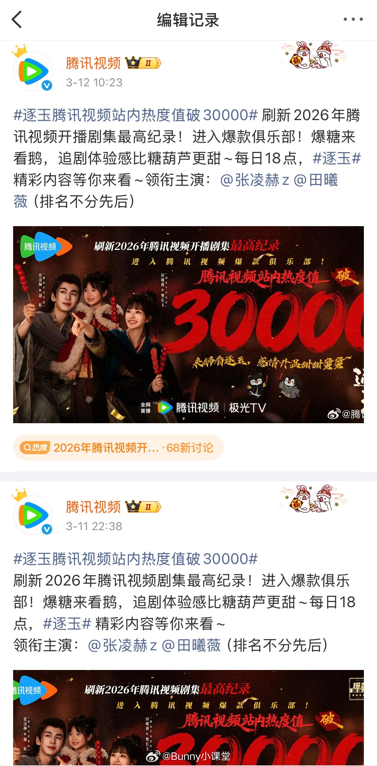 腾讯视频修改逐玉战报!骄阳似我剧粉要求腾讯视频修改《逐玉》的战报措辞,理由是《骄阳似我》才是开年首部爆剧,刚刚腾讯视频官博真的编辑了