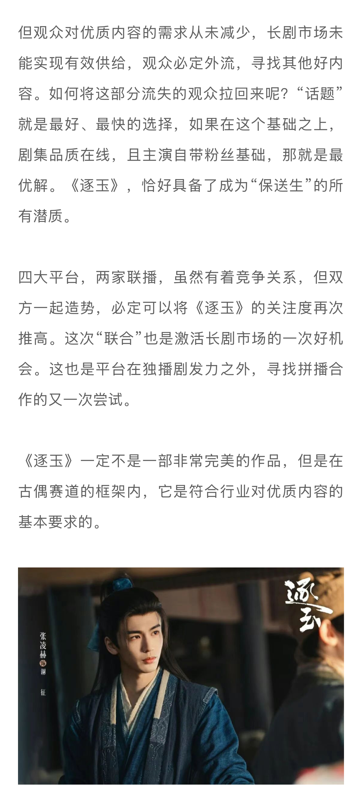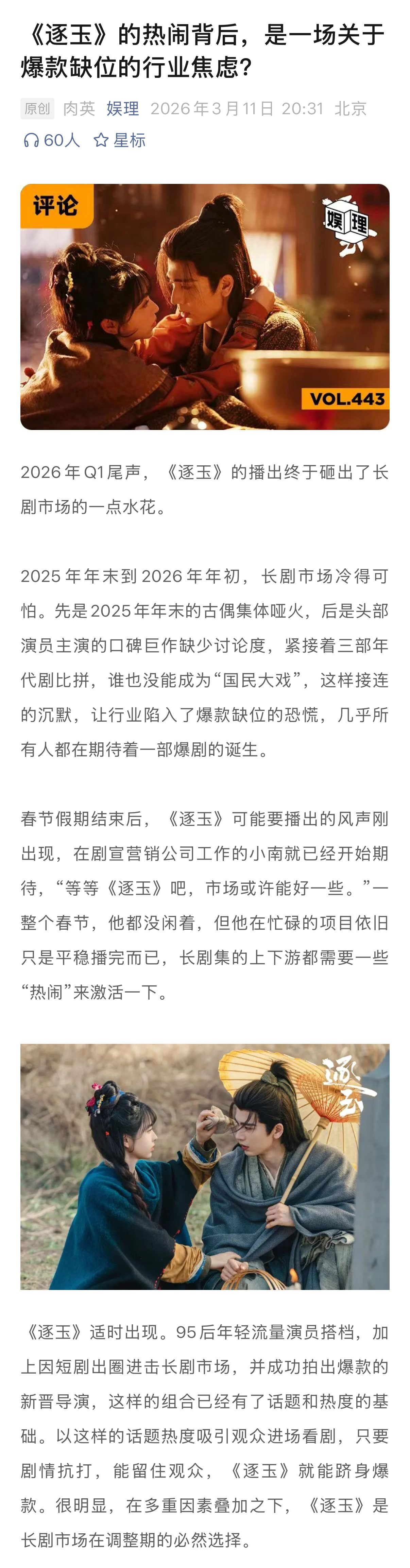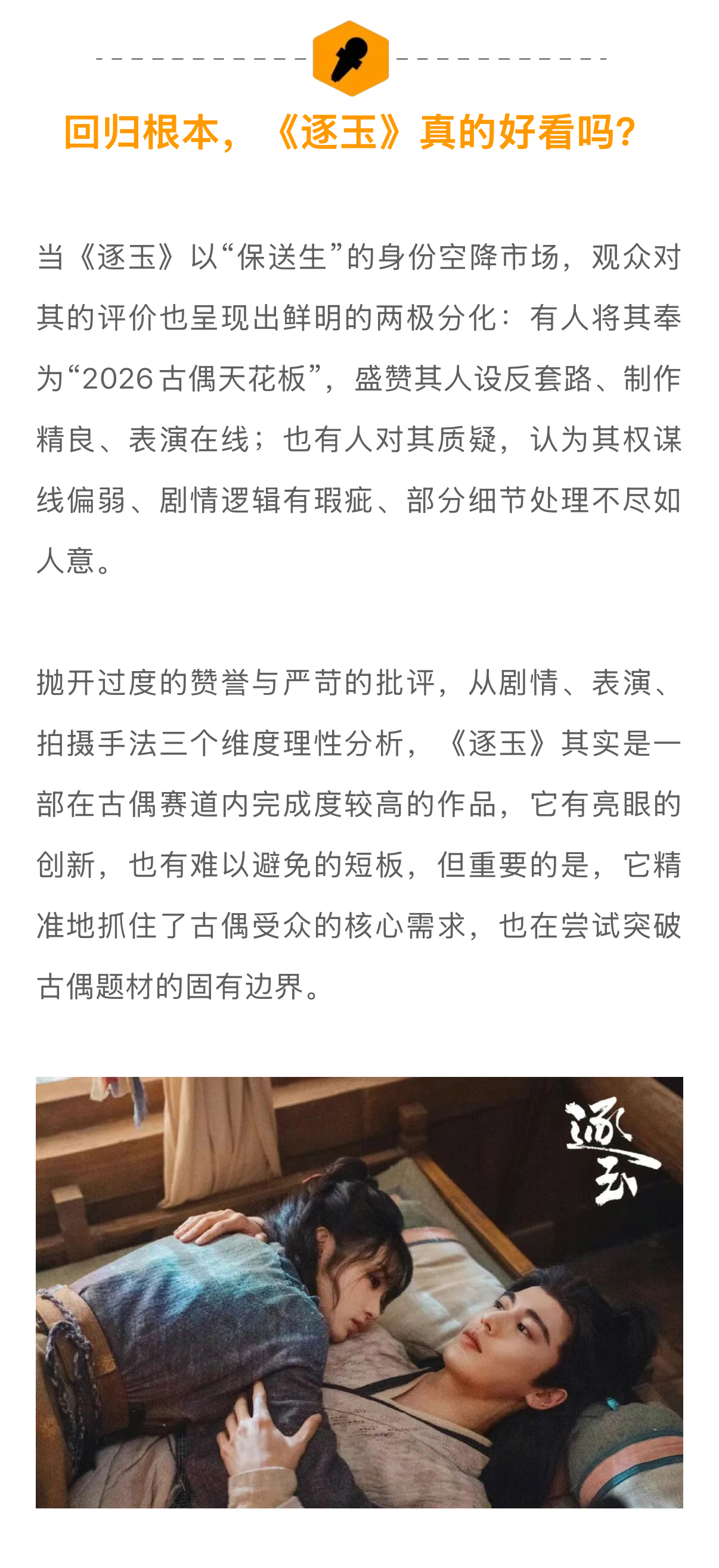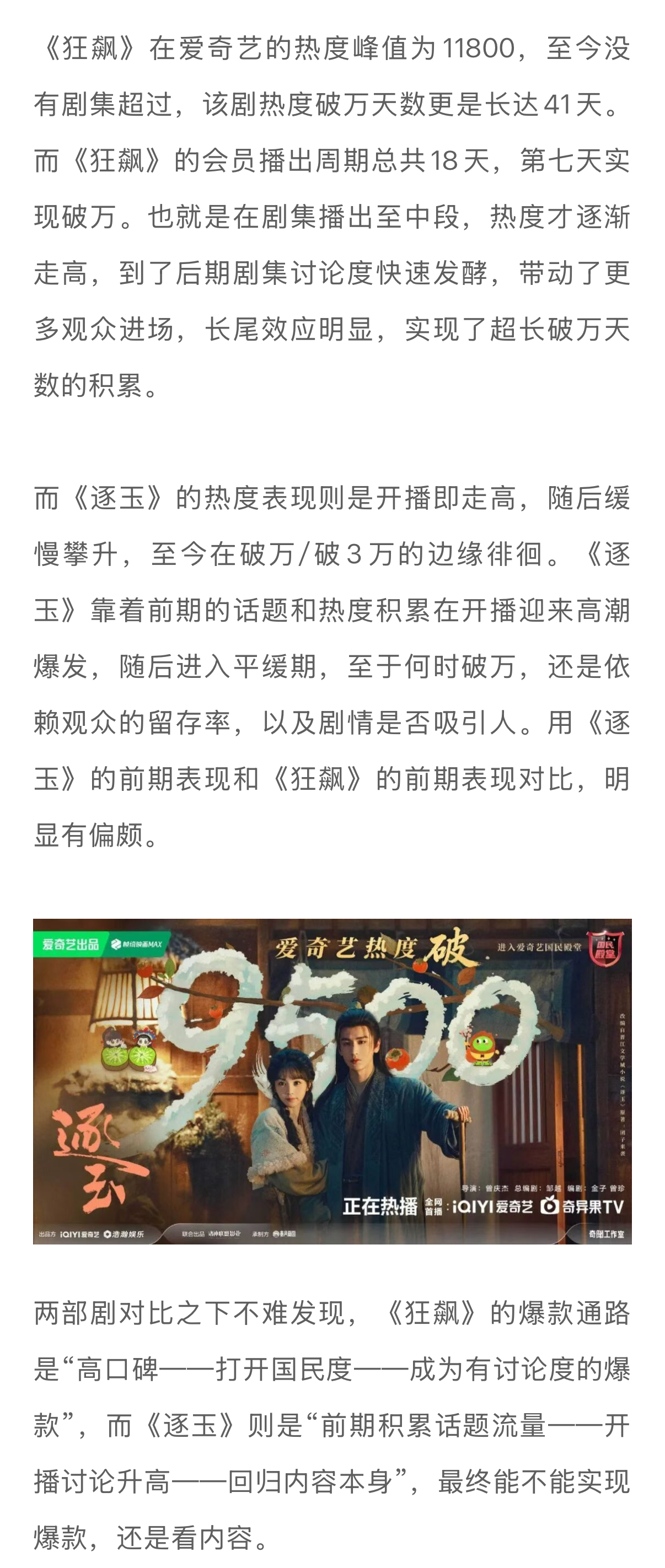 逐玉破万背后的爆剧新逻辑逐玉掀起了长剧市场久违的热闹 《逐玉》中“屠户女”与“落难侯爷”的组合,再对应田曦薇和张凌赫的颜值和真实人设,反差感直接大幅度提升。出圈名场面+神图也说明了导演曾庆杰的审美是被观众认可的。前不久,有营销号说《逐玉》的表现已经超越《狂飙》,被网友群嘲数据作假,但从这两部剧的播出表现对比,实际上就是爆剧逻辑的不同…娱理独家↓