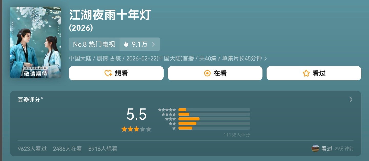 江湖夜雨十年灯 《江湖夜雨十年灯》追完了,各平台的开分也看到了,总的来看,豆