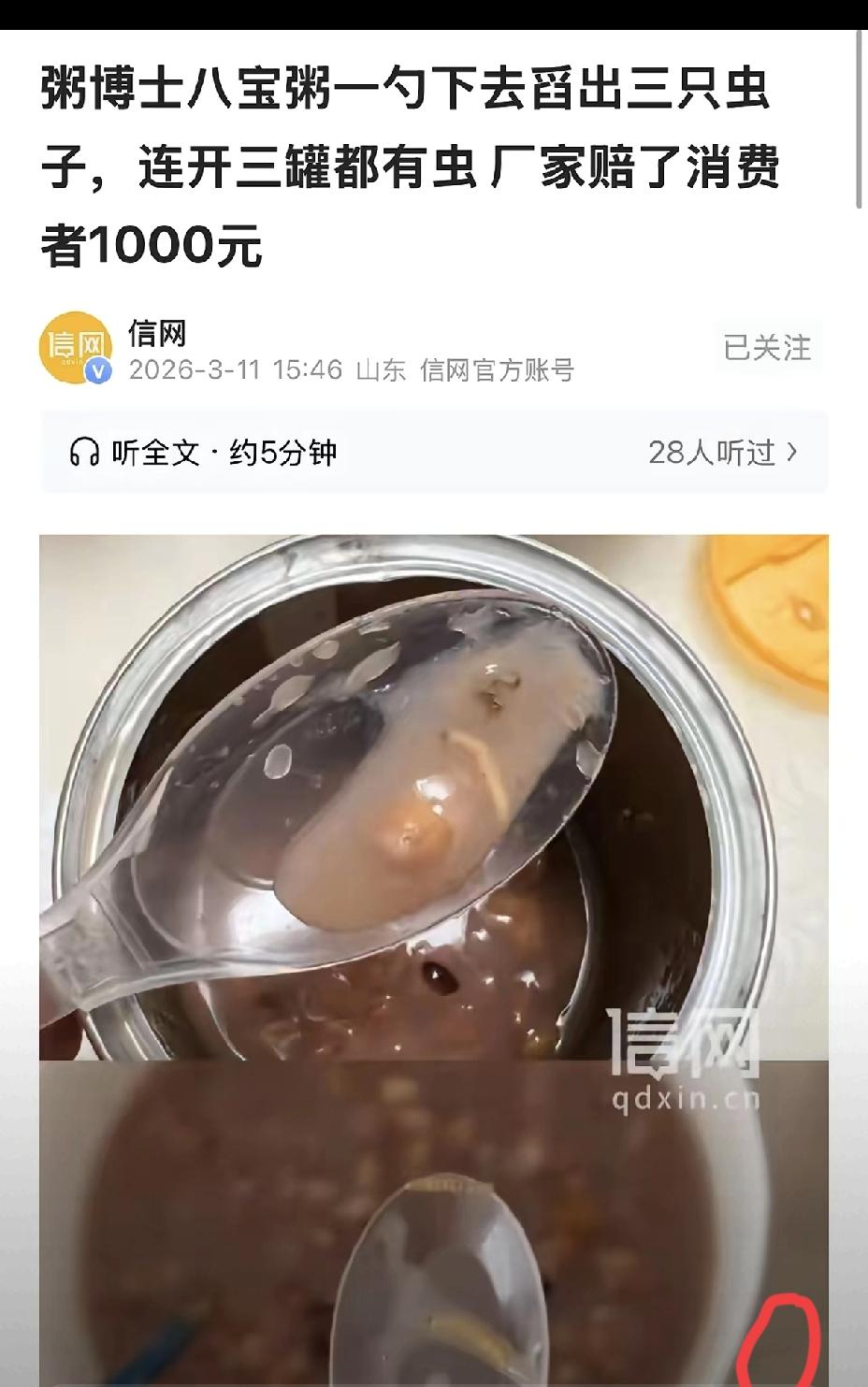 太恶心了!河北男子春节收到的八宝粥,连开几罐全是虫子,舌尖安全不该沦为节日礼品的漏洞。 明明在保质期内,却因原料管控不严出现虫害,厂家一句疏忽就想了事。消费者维权时还因无购物凭证受阻,最终拿到的1000元,只是法律规定的最低赔偿。 很多人觉得礼品食品差不多就行,可食品安全从没有人情可讲。生产环节偷工减料、质检敷衍了事,伤害的是消费者的信任与健康。 别让心意礼盒变成糟心隐患,守住舌尖底线,比任何包装都重要。遇到食品问题,你会坚持维权到底吗?