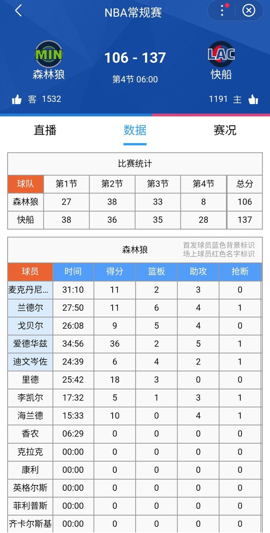火箭输给掘金36分、森林狼31分落后快船,湖人暂时升至西部第三。 等狼船比赛结束