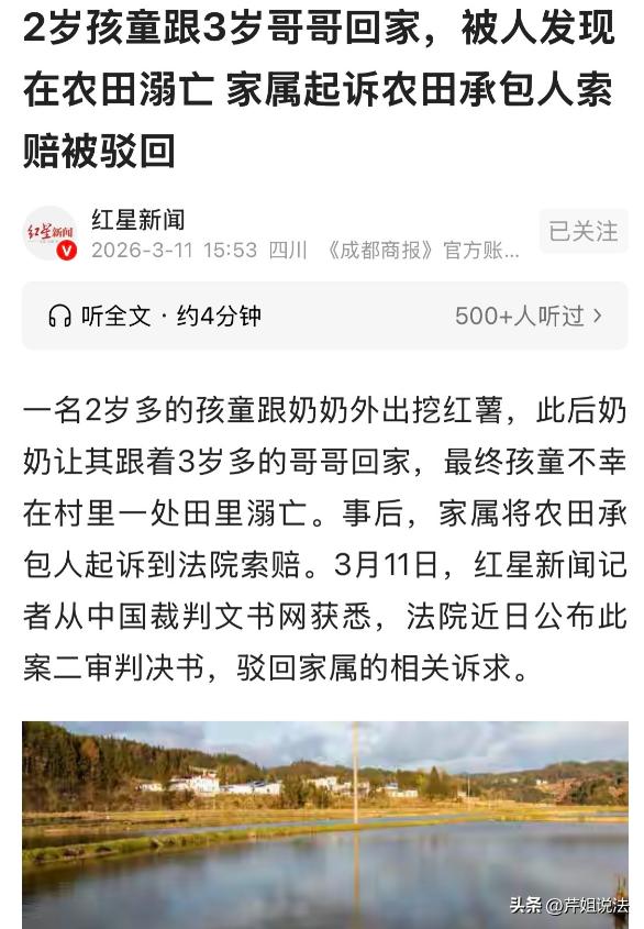 云南,一女子带两个年幼孙子上山挖红薯,中途让孙子先回家,不料孙子回家途中掉进水田,2岁多的小孙子不幸溺亡。女子全家悲痛万分,将水田承包主告上法庭索要49万赔偿。法院审理后作出判决,家属不服上诉,二审法院再次宣判。 太揪心了,才2岁多的孩子,说没就没了,换谁家里都扛不住。 出事那天,是2024年11月2日午后,天气应该还不算冷,56岁的吴某带着俩孙子上山挖红薯。 俩小家伙才3岁多和2岁多,跟在奶奶身后,兴奋得不行,又蹦又跳的,浑身都是孩子气。 挖了没一会,吴某看着俩孙子满身都是泥巴,脏兮兮的,就想着让他们先回家,自己挖完一筐红薯就赶紧回去。 谁能料到,就是这一个随口的决定,酿成了无法挽回的悲剧。 俩孩子手牵手往山下走,年纪太小,也没什么方向感,走着走着就偏离了平时走的路,不知不觉就到了村民张某承包的田边。 那片水田也不是一直种着东西,之前荒了挺久,直到2024年3月,张某才把它清理出来,打算后续耕种。 大概下午四点左右,村民张某辛正好路过这片水田,一眼就看到俩孩子在水里挣扎,吓得赶紧跑过去把他们救了起来。 可惜,2岁多的小孙子已经没了呼吸,再也醒不过来了,3岁多的哥哥万幸,经过急救保住了性命。 吴某得知后,当场就瘫坐在地上,那种绝望,估计只有当奶奶的才能体会。 一家人沉浸在悲痛里,越想越难受,最后把矛头指向了水田承包主张某,觉得是他清理田地留下了安全隐患,才导致孩子溺亡。 没商量出结果,家属直接把张某告上了法庭,一开口就索要49万的赔偿,想着能给逝去的孩子一个交代,也弥补一下心里的伤痛。 可法院一审,直接驳回了家属的全部诉求,这让本来就悲痛的一家人更难接受了。 不甘心,他们又提起了上诉,把赔偿金额降到了9.9万,哪怕少一点,也想讨一个说法,可没想到,二审法院还是维持了原判。 孩子溺亡在张某的水田,水田承包主张某,需要对孩子溺亡承担赔偿责任吗? 根据《民法典》第1165条,行为人因过错侵害他人民事权益造成损害的,应当承担侵权责任。 张某只是清理了自己承包的荒田,打算耕种,这是他合法行使土地承包经营权的行为,符合《农村土地承包法》第八条、第九条的规定,没有任何过错。 水田本身是农业生产用地,不是公共场所,也不是危险源,张某没有法定的安全保障义务,不需要设置围栏、警示标志,不能因为孩子意外落水,就强加责任给张某。 吴某作为带孩子的监护人,有责任吗? 根据《民法典》第三十四条、第三十五条,监护人应当履行监护职责,保护被监护人的人身安全,未尽到监护职责造成被监护人损害的,应当承担侵权责任。 吴某明知俩孩子年幼,没有自我保护能力,却让他们独自回家,放任危险发生,没有尽到监护义务,这才是孩子溺亡的根本原因,理应承担全部责任。 出了事就该找场地所有人的理由,这就是典型的道德绑架,法律不支持这种逻辑。 水田不是泳池、水库等高危区域,承包主没有义务为他人的监护失职负责,不能把自身过错转嫁到无辜者身上。 家属降低赔偿金额,不代表就有道理,判决看的是过错程度,不是同情,哪怕索赔1元,没有法律依据,也会被驳回,这就是法律的公平性。 悲痛可以理解,但不能丧失理智。 孩子的离去让人痛心,但不能因为自己的监护失职,就去讹诈无辜的人,这样不仅对不起逝去的孩子,也会寒了普通人的心,更是对法律的不尊重。 监护责任不是一句空话,尤其对于年幼的孩子,片刻都不能疏忽。 吴某的一时大意,毁掉了一个孩子,也毁掉了一个家庭,这节课,每个监护人都该好好上,别让一时侥幸,酿成终身悔恨。 一审法院,驳回了家属索要49万赔偿的全部诉求,家属不服上诉后,二审法院维持原判。 也就是说,水田承包主张某无需承担任何赔偿责任,所有责任都由孩子的监护人自行承担。 有人说监护人失职,有人说承包主该担责,大家站在不同的角度,有不同的看法。 你们觉得,这个判决合理吗?如果是你,会支持哪一方?快来评论区说说你的观点~