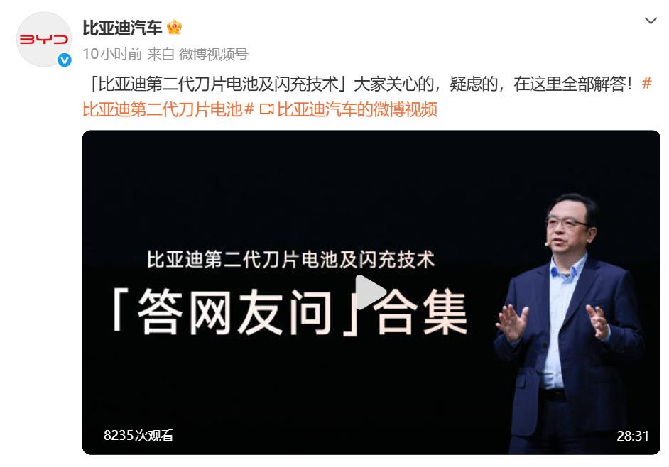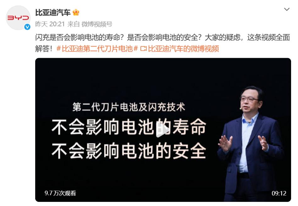 比亚迪这两天面对网络舆论,并没有做出任何反驳,而是不断重声船夫在发布会上说的话。 这么一看,其实现在这些对闪充影响寿命的言论,比亚迪早就预判到了。所以在发布会上,人家逐句逐字告诉你,闪充不会影响电池寿命,也不会对电网造成冲击,更不会影响电池的安全。 我看了一下@比亚迪汽车 ,这两天就针对闪充安全这个事儿连发了多条视频,这些视频都是在发布会上就已经说清楚的东西,没有增减任何内容。 以我的理解来看,那些讨论比亚迪闪充是否影响寿命、闪充安不安全的争议,其实也没必要争个输赢,我们直接看结论就行了。 比亚迪给出的结论就是第二代刀片电池质保政策全面加码,直接在原有的基础上,电池容量保持率全部再提升2.5%。 再就是安全,完成500次闪充循环后进行边充边针刺无热失控;同时挑战4节电池短路,周边电芯未发生热扩散;底部撞击试验能量达新国标10倍,电池包受损后依然不起火、不爆炸,用技术重新定义电池安全标杆。 如果实在绕不过那些争议,咱们直接看结论就好了,有这份保障就,就说明比亚迪是完全放心让用户使用闪充的,也说明比亚迪对自家第二代刀片电池非常有信心。