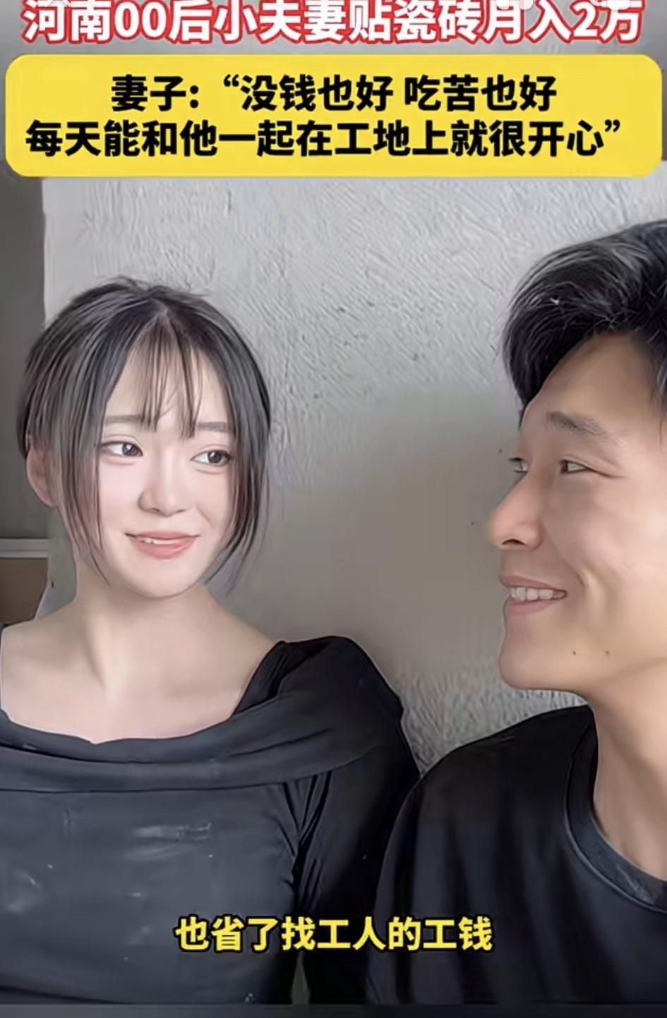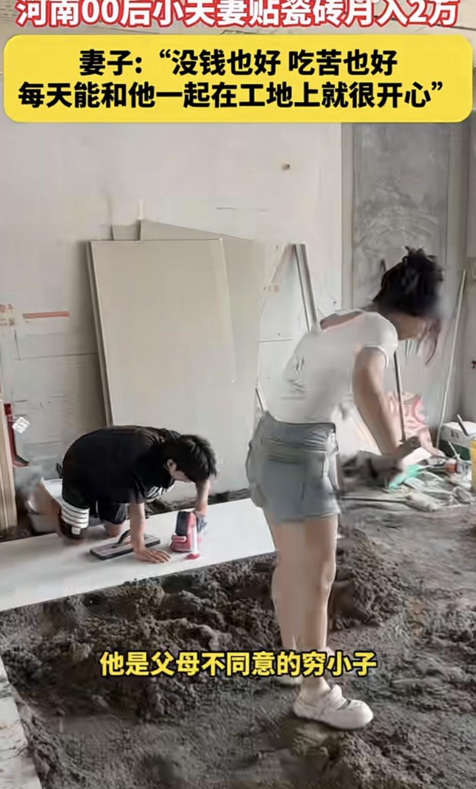 河南周口,一00后女子在网上分享,她和自己00后的老公一起贴瓷砖的日常工作。而夫妻俩贴瓷砖,不仅一个月能挣2万块,更让人羡慕的是,女子对老公真情告白,没钱也好,吃苦也好,只要每天能和老公一起在工地上干活,就特别开心特别幸福!为此更是看得网友们都直呼:这老公也太幸福了吧! 据女子表示,二人在一起都七年多了,当时谈婚论嫁时,老公啥也没有,这父母也不同意女子嫁给这个“穷小子”,但女子就是愿意跟他在一起。 因为女子觉得,看人不能光看有钱没钱,主要是平日里老公对她好,还特别的勤奋,所以没钱也好,吃苦也好,只要能跟着老公在工地搬个砖,打个灰啥的,也挺开心的。 目前,夫妻俩就一起在工地上贴瓷砖,而有女子的帮助,老公干活也快点了,更是省了招工人的工钱。 对此有网友就表示:重活都是男人干,女子帮忙打下手,应该不太累,两个人月人过万,女孩管钱没有压力,我觉得挺好。关键是女子对老公真情实意,这男人得有多幸福啊! 也有网友表示:后悔的日子在后面呢,你还是年轻呀姐妹,可想清楚了。 还有网友表示:室内工作,不用风吹日晒,没同事勾心斗角,还不用加班,月薪过万,还有自己喜欢的人陪在身边,为什么会后悔?羡慕还来不及了! 更有网友表示:有此贤妻,夫复何求!就姑娘死心塌地的愿意和老公吃苦就很难的了,总之一定不要让她输,要让她狠狠的幸福下去! 不得不说,夫妻俩从什么也没有,到现在克服困难,靠着自己的双手月入两万,足以说明,夫妻同心,其利断金!也相信,只要二人勤奋和睦,很快便会实现自己的小目标! 话说回来,女子五官正,三观更正,她愿意陪老公吃苦受累,更说明了她对老公的真情实意! 正如网友所说,这一刻让人又相信爱情了!而拥有这样愿意与你这同甘共苦的女妻子,不仅难得可贵,更是做老公的一种福气!因为有她在,就有幸福在你身边,老公可得好好珍惜这样真情实意的好妻子了!