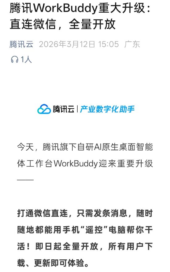 新浪科技讯3月12日下午消息,今日,腾讯旗下自研AI原生桌面智能体工作台WorkBuddy迎来重要升级。官方表示,打通微信直连,只需发条消息,随时随地都能用手机“遥控”电脑帮你干活,据悉该功能即日起全量开放,所有用户下载、更新即可体验。