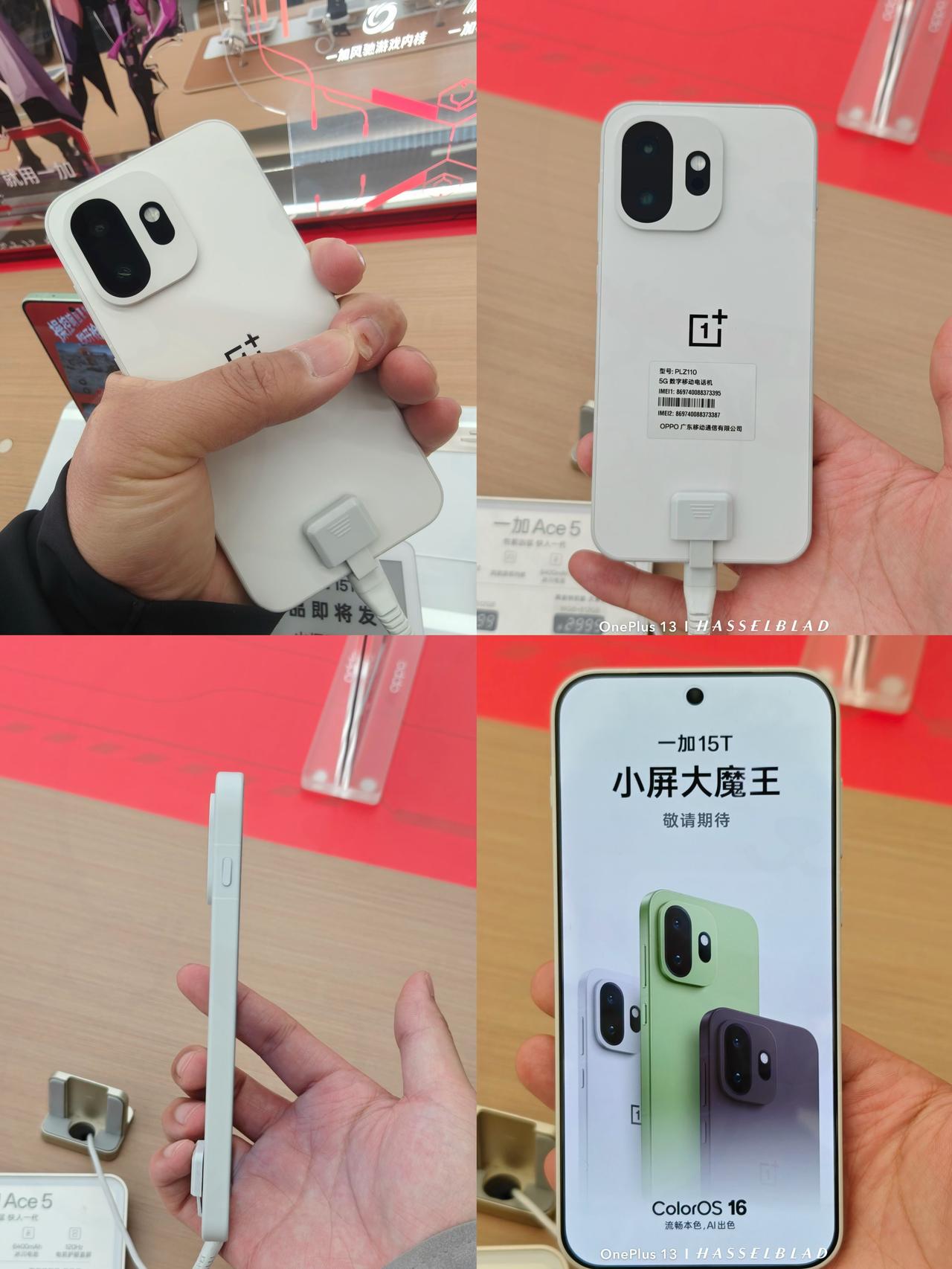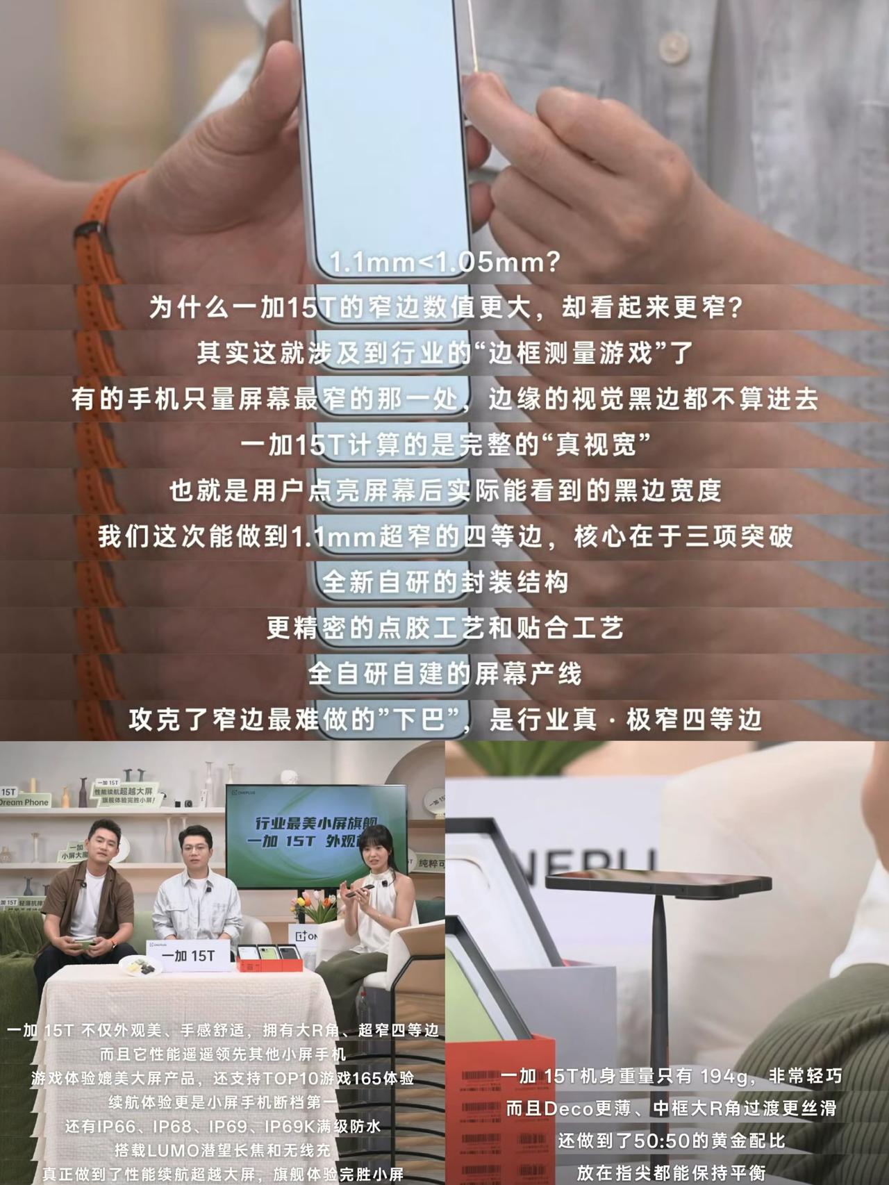 到店体验一加15T了,已知右边东方屏~ 真的是不上手不知道,光看直播觉得李杰拿着手机跟一加15没啥区别,无非就是个头小了点,但真上手后惊呆了... 6.32英寸,实际机身比较窄,手稍大点的,就是可以单手环抱住。并且机身工艺升级后,摸起来有种小孩儿的肌肤感,就金属中框和后盖摸起来竟然有点丝绒的润感/可可色也真的是长在心巴上的审美... 然后R角控制的出色了,尤其正面四等黑边1.1mm,以至于看上去觉得屏占比很大,视觉效果又有点不像6.32英寸小屏机。(以防各位不知道什么概念,P3是宽度对比图) 50比50的配重不多说了,昨晚李杰直播直接用个笔就能顶起来,很均衡,194g跟职业选手说的一样,打久了端在手上也不觉得累手,旗舰的质感跟性能...目前外观解禁,其他东西还看不了,屏幕能看个大概,大家自己对比下跟一加15东方X3屏的区别,反正我是没看出来 最后再回顾下配置: 🎮性能:骁龙8Elite Gen5/风驰游戏内核调教丨电竞三芯 📷影像:主摄50MP LYT700(OIS)/潜望长焦50MP JN5 3.5×焦段(OIS)丨LUMO影像系统 🔋续航:7500mAh冰川大电池+100W超级闪充+50W无线充电 📱屏幕:1.5K+165Hz的电竞小直屏/边框1.1mm 💧防水:IP66/68/69/69K 大家觉得一加15T如何?建议去线下摸摸,工艺的确不同,然后大家觉得会定价多少呢?