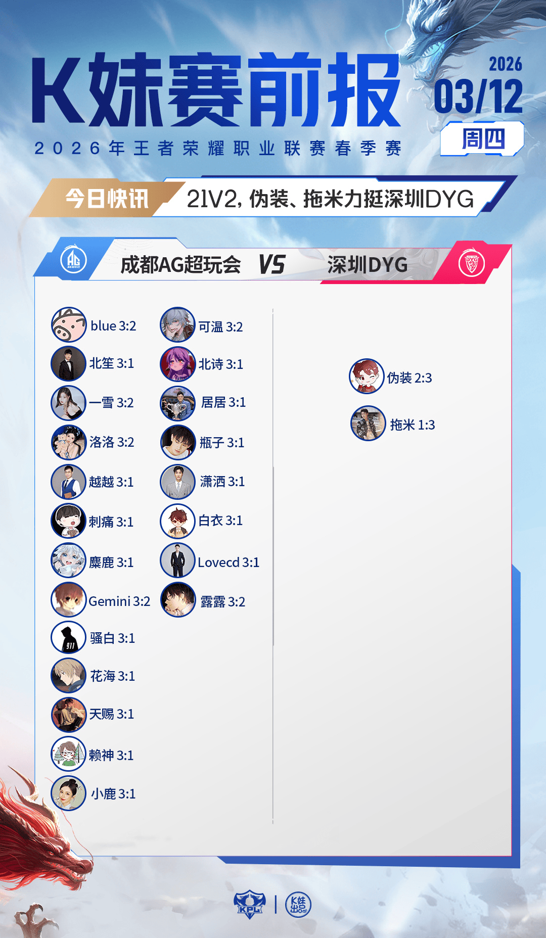 虎扑03月12日讯[K妹赛前报]Gemini等21位嘉宾看好AG,伪装/拖米力挺DYG